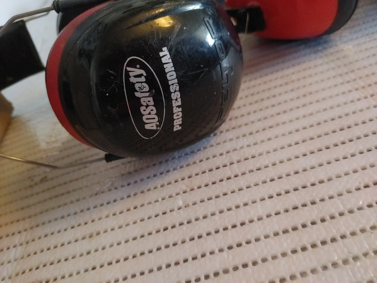 AOSafety Professional earmuffs in red and black. They're designed for hearing protection. These earmuffs are adjustable for a comfortable fit.