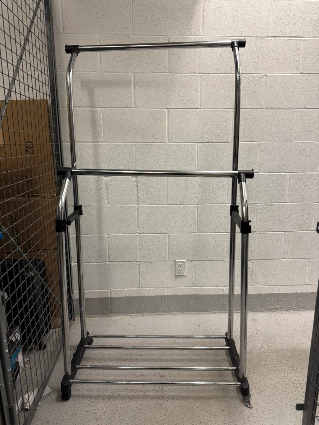This double bar garment rack offers ample hanging space for clothes.