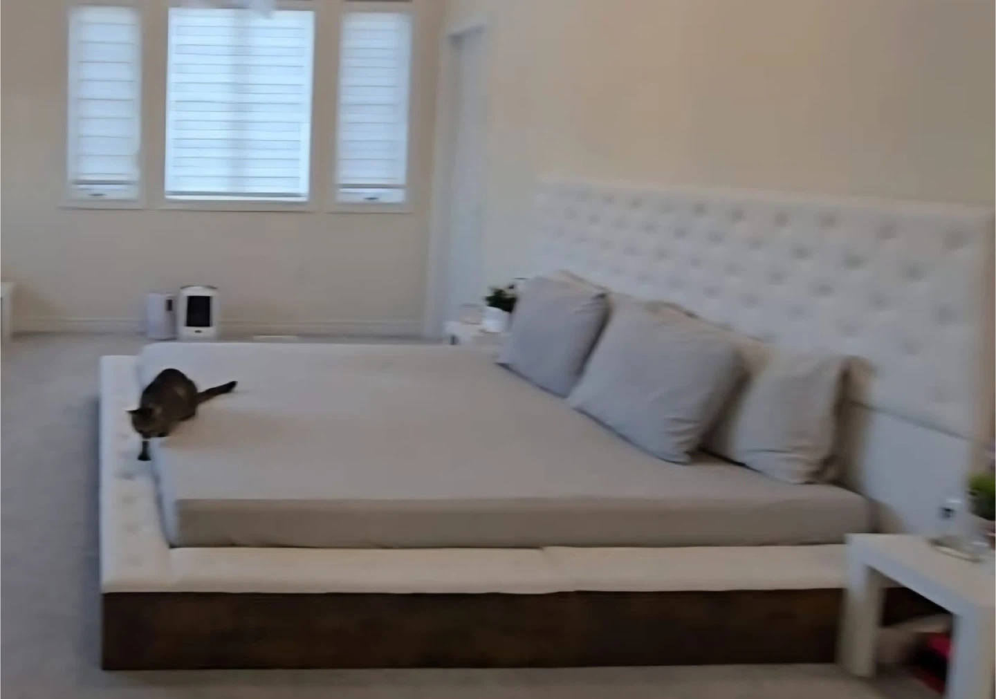King size bed frame with a tufted white headboard. It has a dark wood base and white upholstered sides. Perfect for a bedroom! Get $1200 king bed for $200. Fits ikea king mattress.