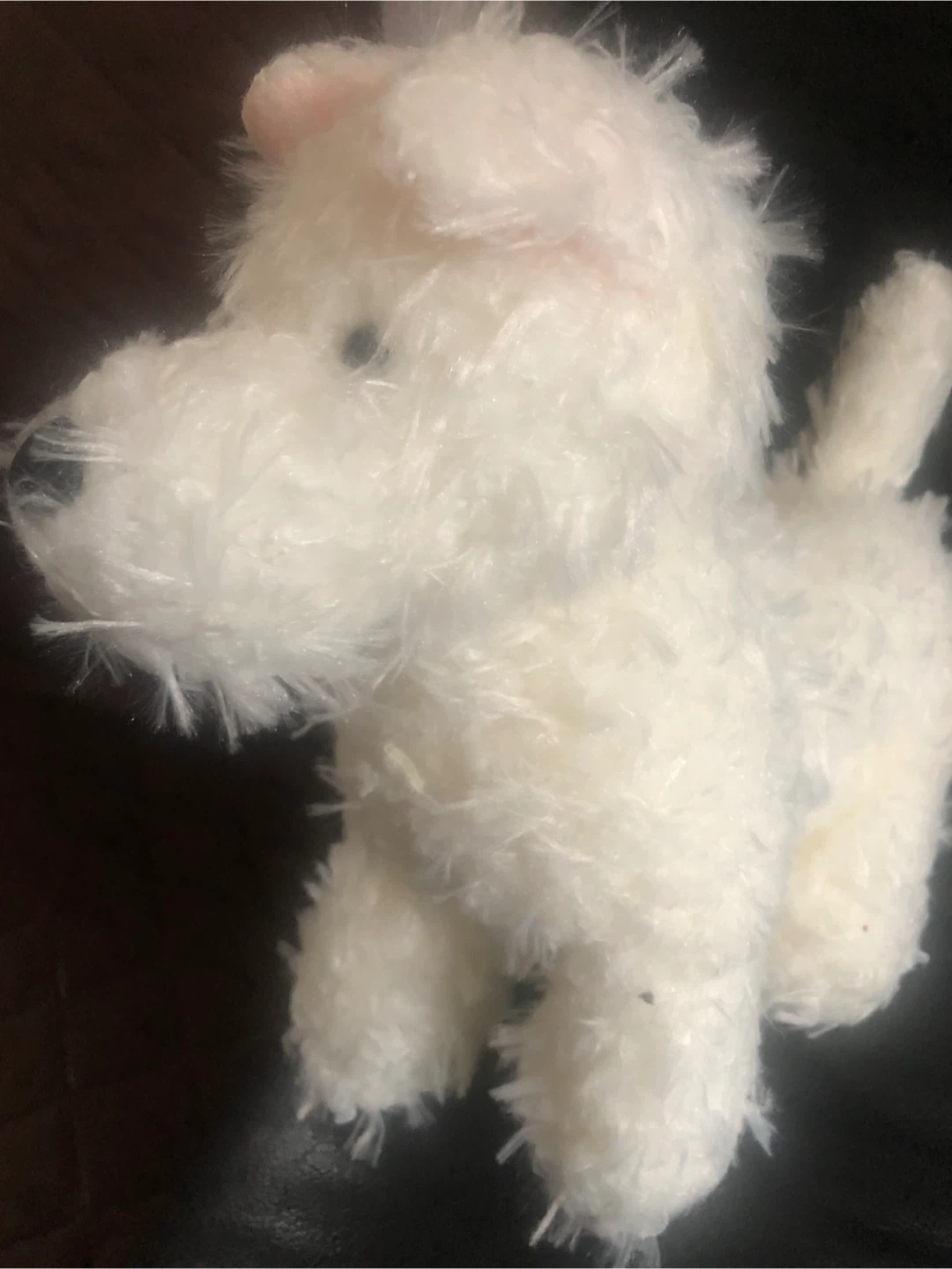 It's a cute white fluffy Lama plushie! Soft and huggable, it's perfect for cuddling. Made with fuzzy material, it has a black nose and pink inner ears. Great for kids!
