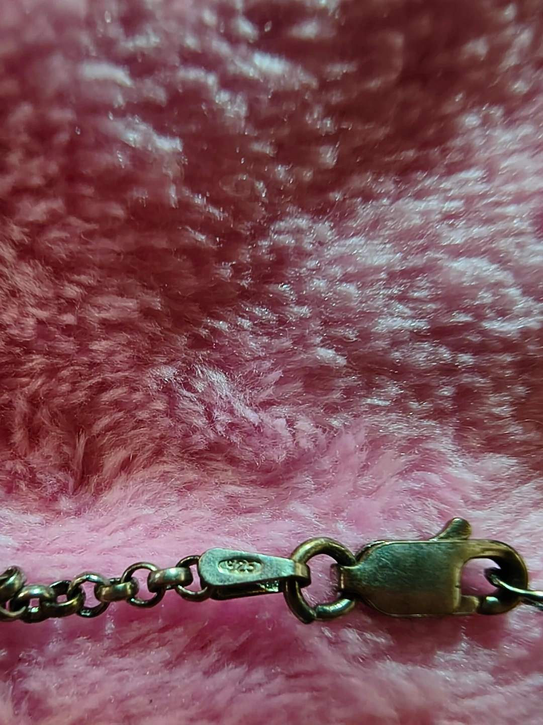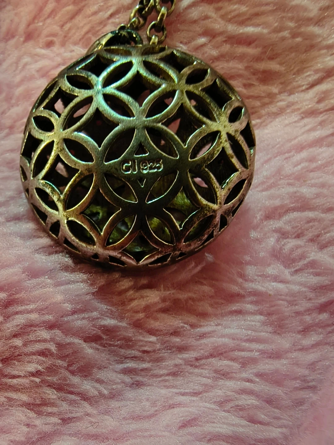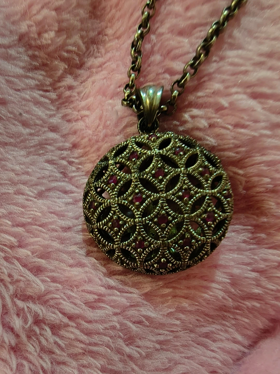 Sterling silver pendant necklace, platinum plated, with a circular, filigree design featuring ruby stones. Clasp marked 925. It's a lovely accessory!
