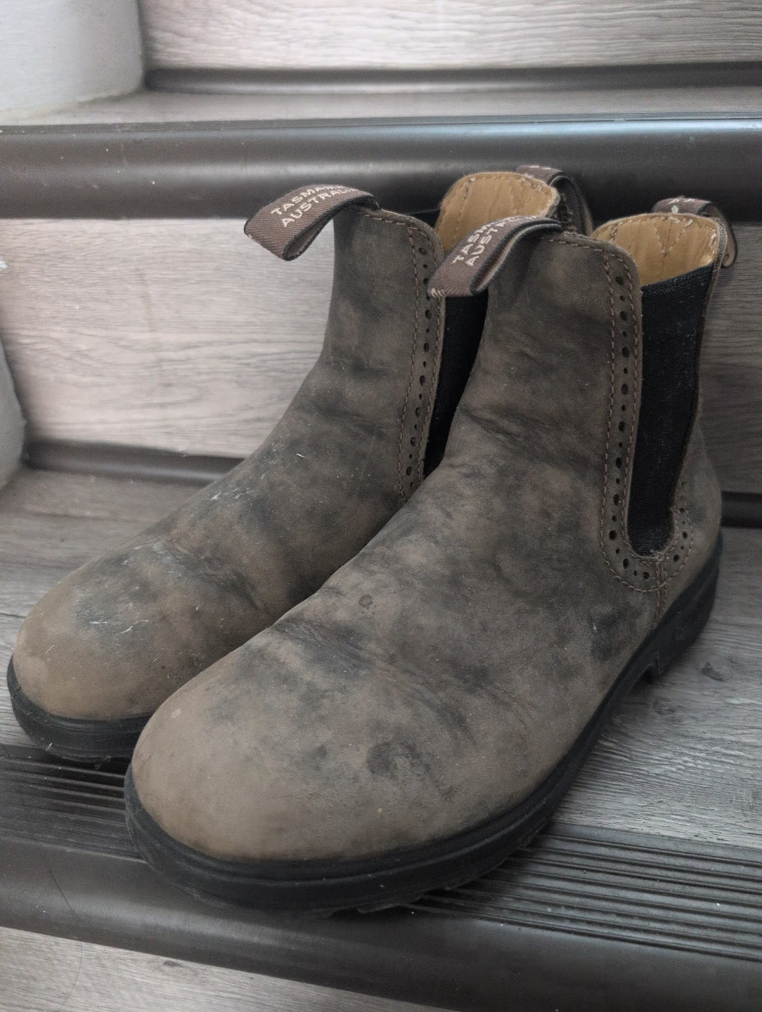 Brown leather Blundstone Chelsea boots. These boots feature elastic side panels and pull tabs. Leather material.