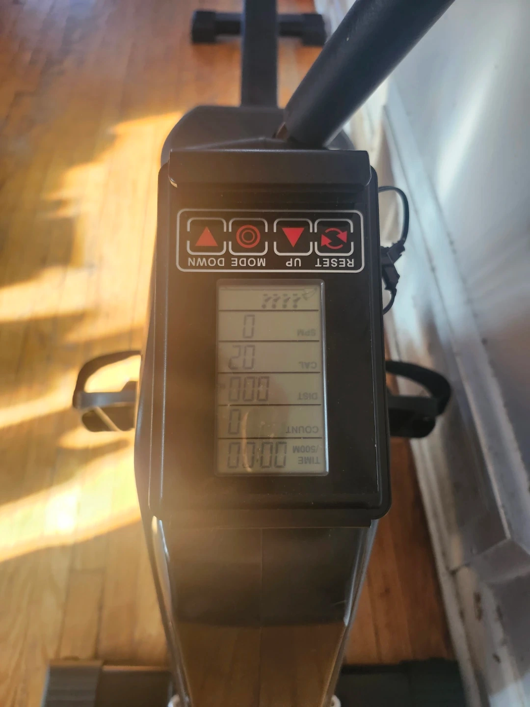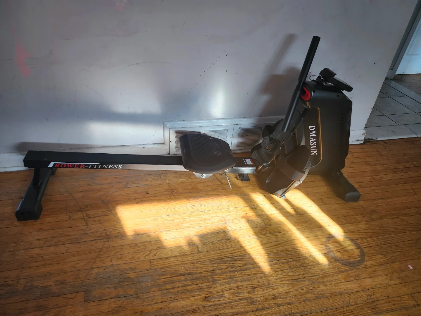 This DMASUN Rower-Fitness rowing machine is great for a full-body workout. It features a digital display showing time, count, distance, calories, and strokes per minute. The seat is padded for comfort during use.check.all the pictures