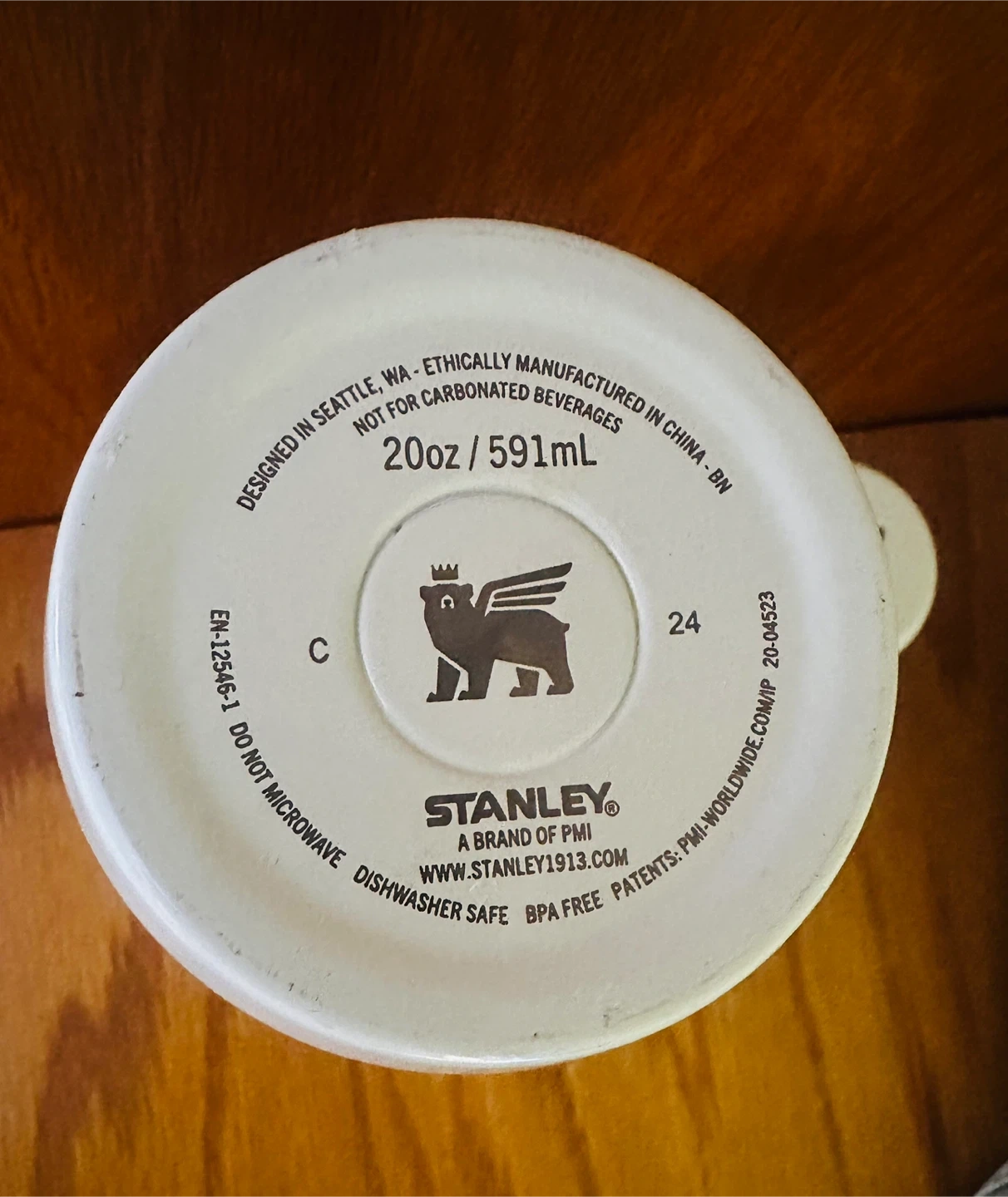 Stanley insulated bottle. Holds 20 oz / 591 mL. Dishwasher safe. BPA free. Not for carbonated beverages. Designed in Seattle, WA.