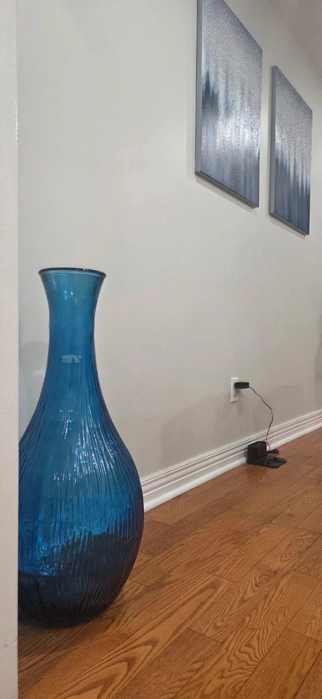 A tall blue glass vase with a textured ribbed pattern. It's a beautiful accent piece for any room. Ideal for holding large bouquets or as standalone decor.