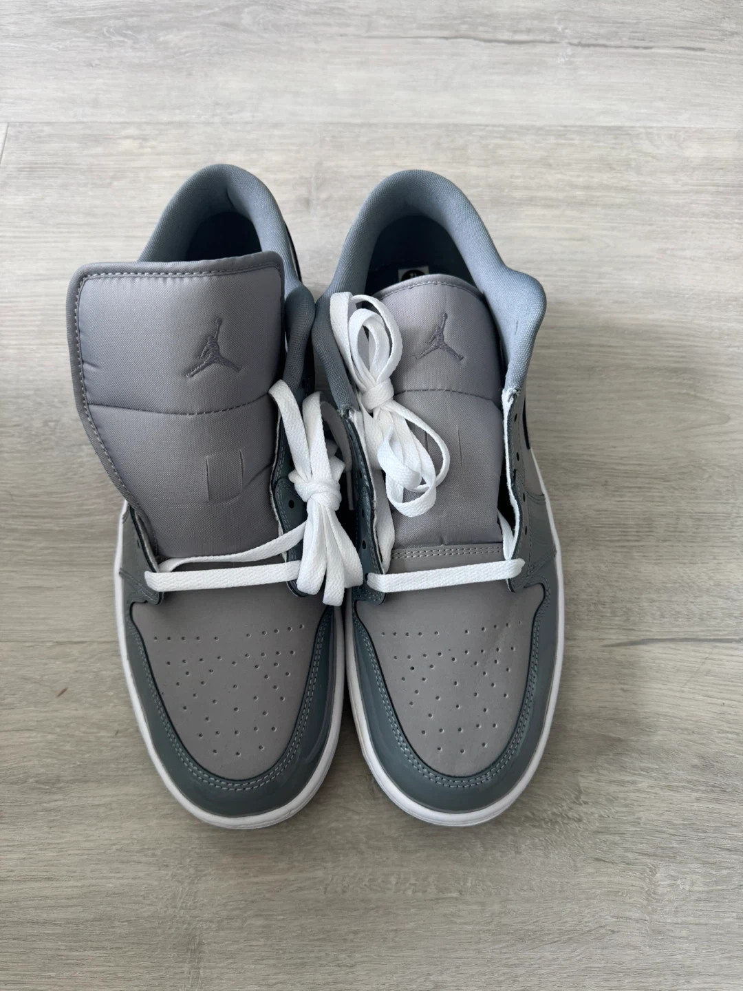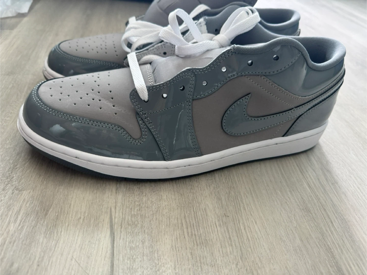 These Air Jordan 1 Low sneakers feature a cool grey colourway with patent leather accents. They're designed for a classic look and comfortable fit. Great for casual wear or sports!