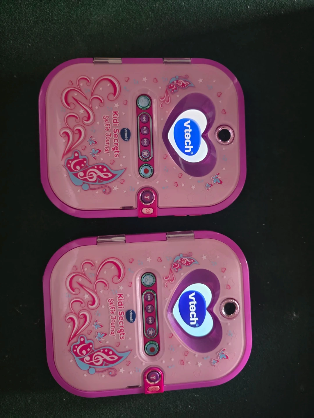 This VTech Kidi Secrets Selfie Journal is pink and purple. It's designed for kids to write secrets and take photos. The journal has a keyboard and a screen for interactive play.