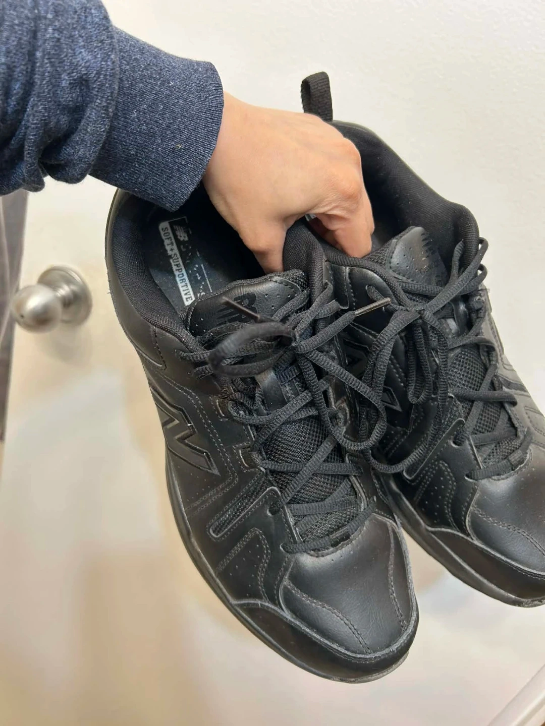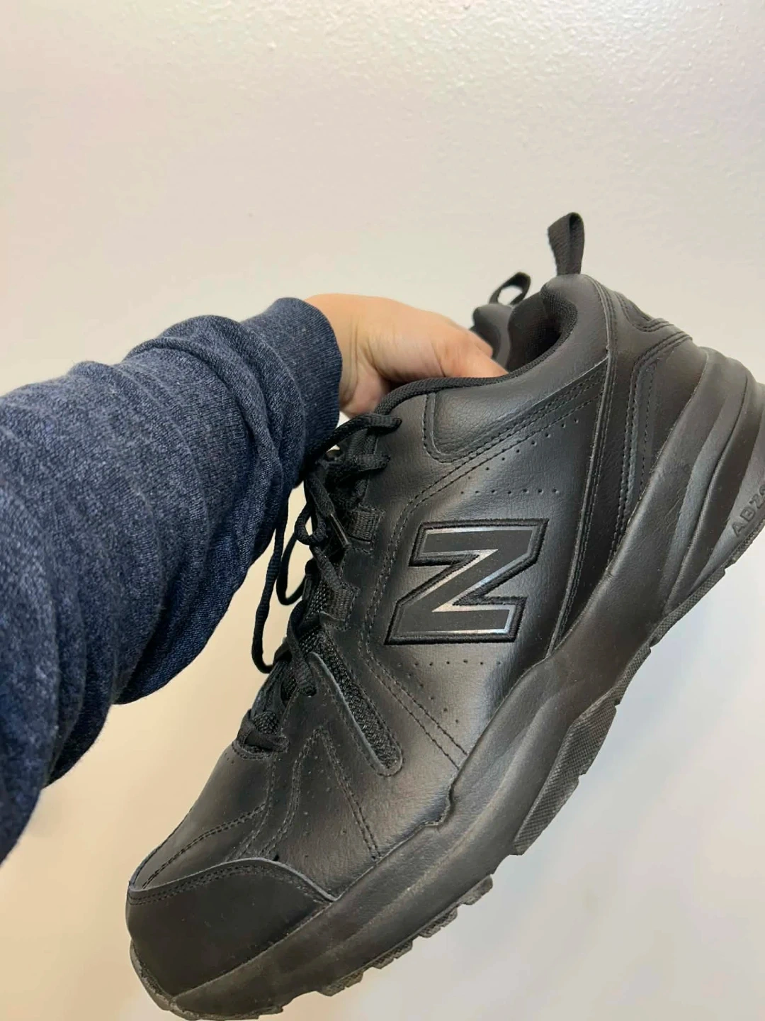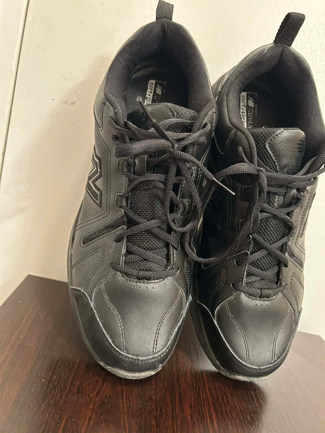 New Balance MX608AB5 walking shoes in black. Men's size 13 US, 12.5 UK, 47.5 EU. These shoes are made with leather and synthetic materials. They feature a soft and supportive insole. Great for walking and everyday wear!