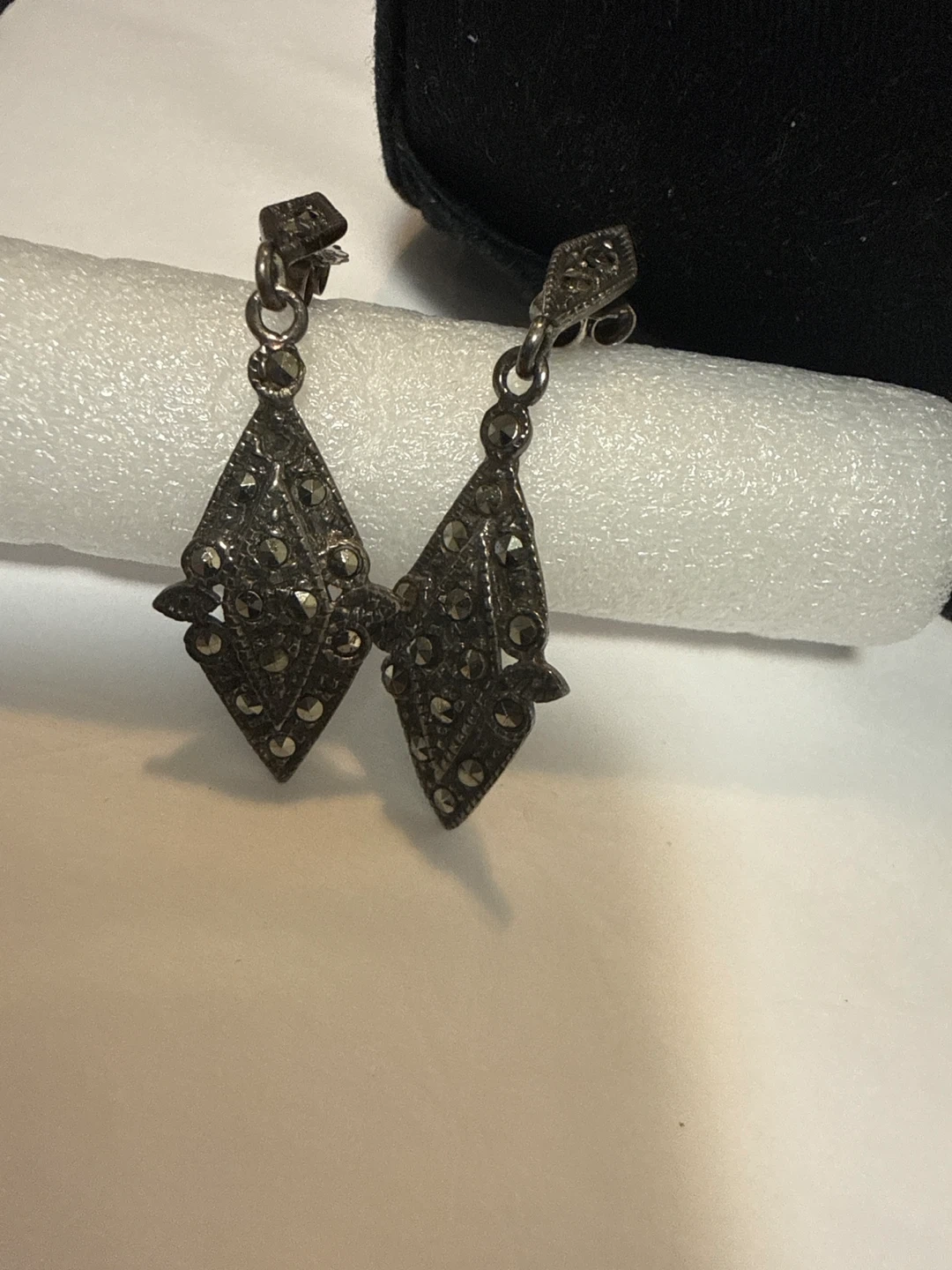 A pair of vintage dangly earrings featuring intricate marcasite detailing. They have a clip-on backing. These earrings are perfect for adding a touch of classic elegance to any outfit!