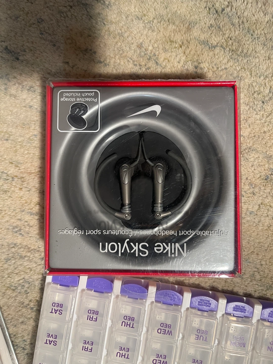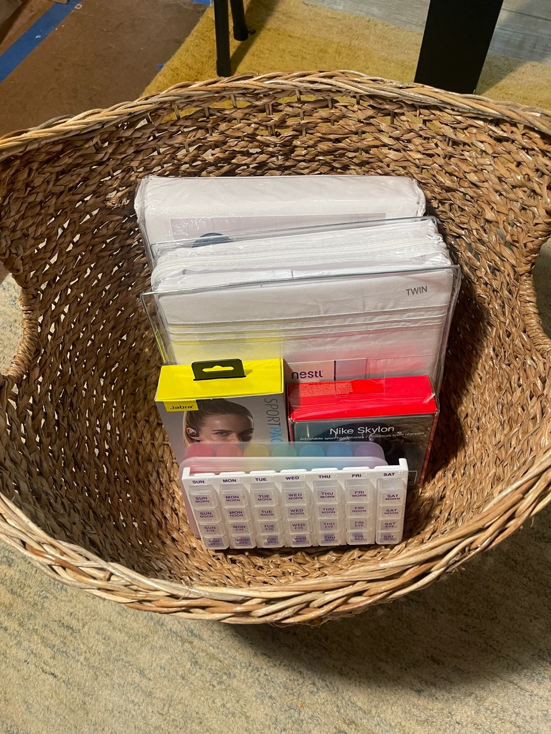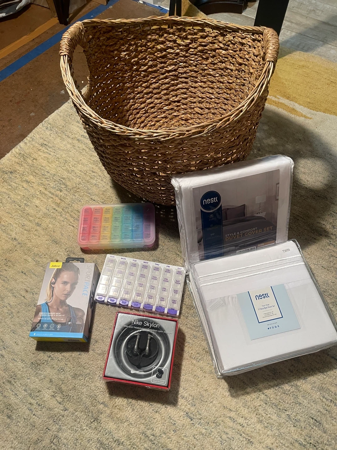 Bundle of great stuff. Big wicker basket, two new large pill cases, jabra wireless earbuds, Nike sport headphones, new twin sheet set and duvet. $25 for ALL. Manhattan midtown east