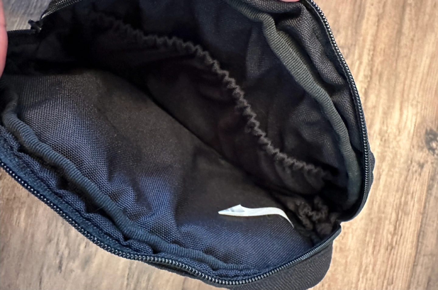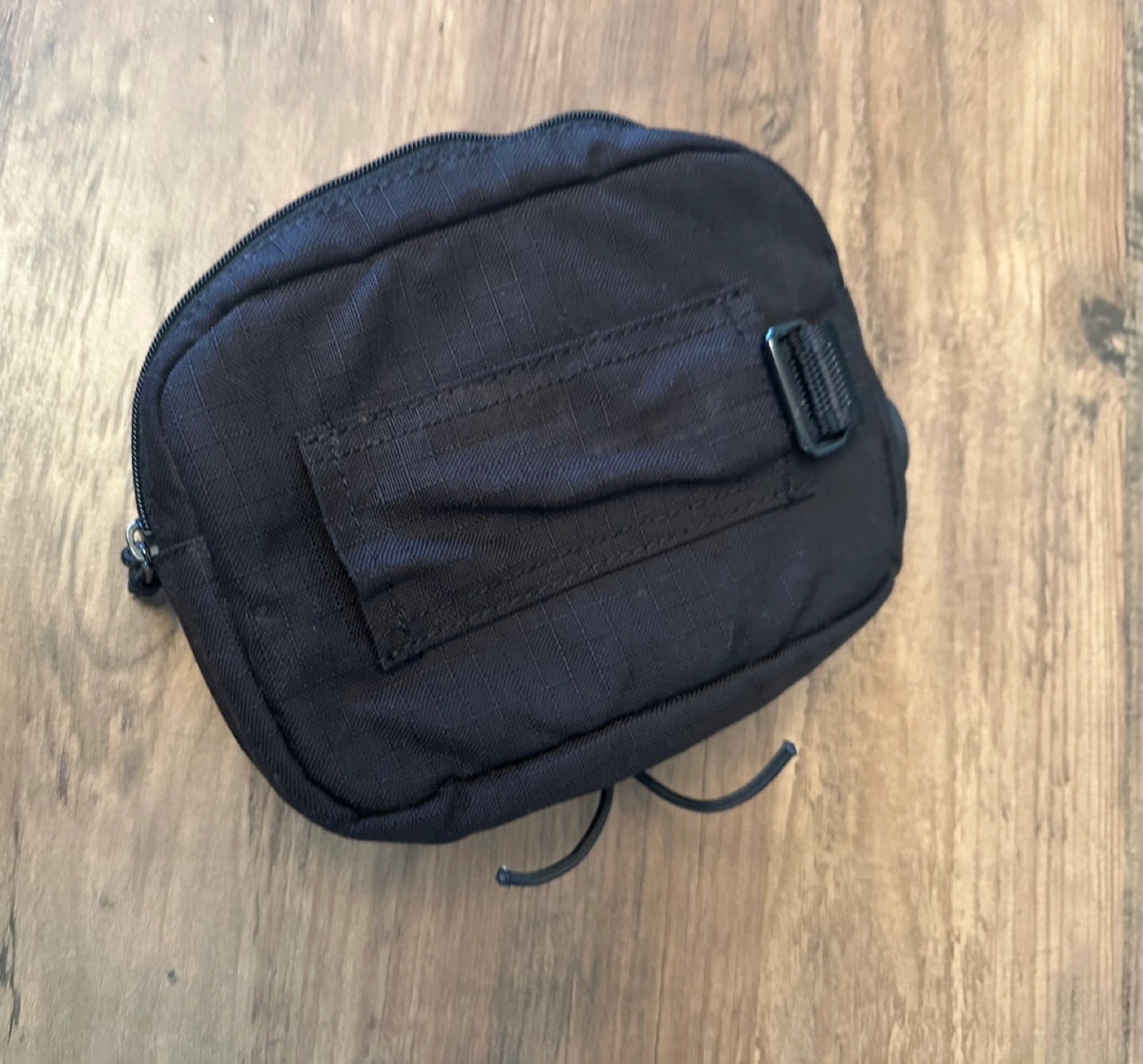Small black pouch with zipper closure. Features an elastic strap inside and a clip on the outside. Good for carrying dog treats, poop bags, etc. New condition!!