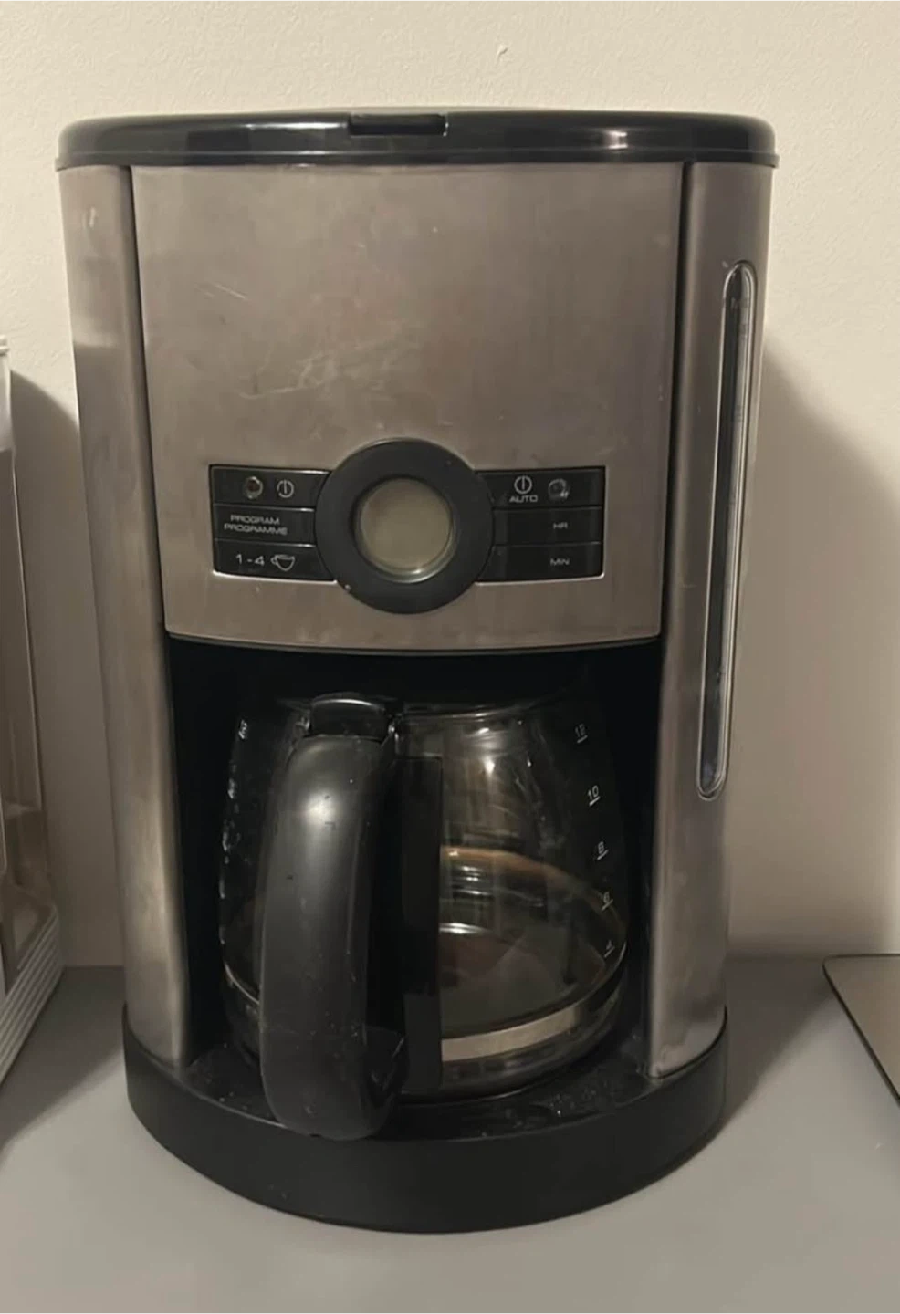 Selling a used coffee maker. It has a silver exterior with a black base and top. The carafe is glass and has a black handle. It features a programmable function and an auto shut-off function, making it a convenient addition to any kitchen
