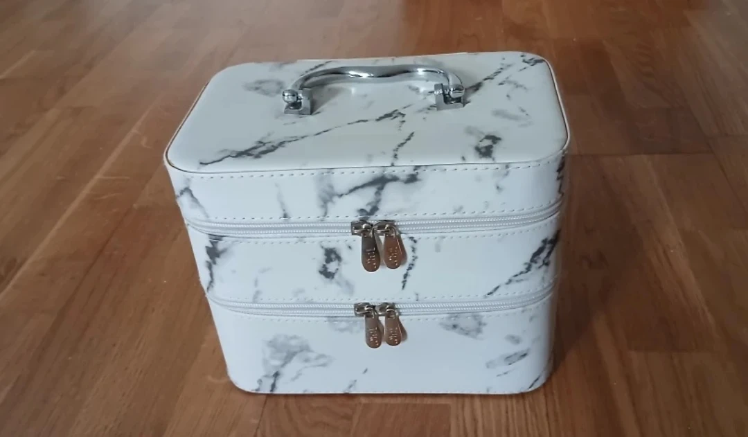 This cosmetic or jewellery organizer features a marble pattern exterior and a pink interior. It includes a small mirror inside the lid. It's perfect for organizing jewellery, makeup or toiletries for travel or home use.