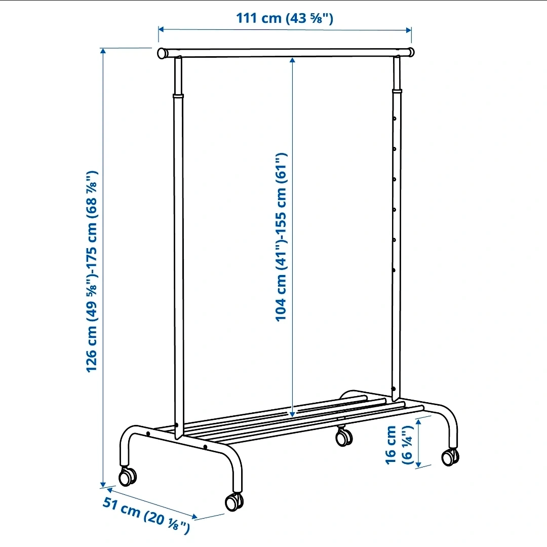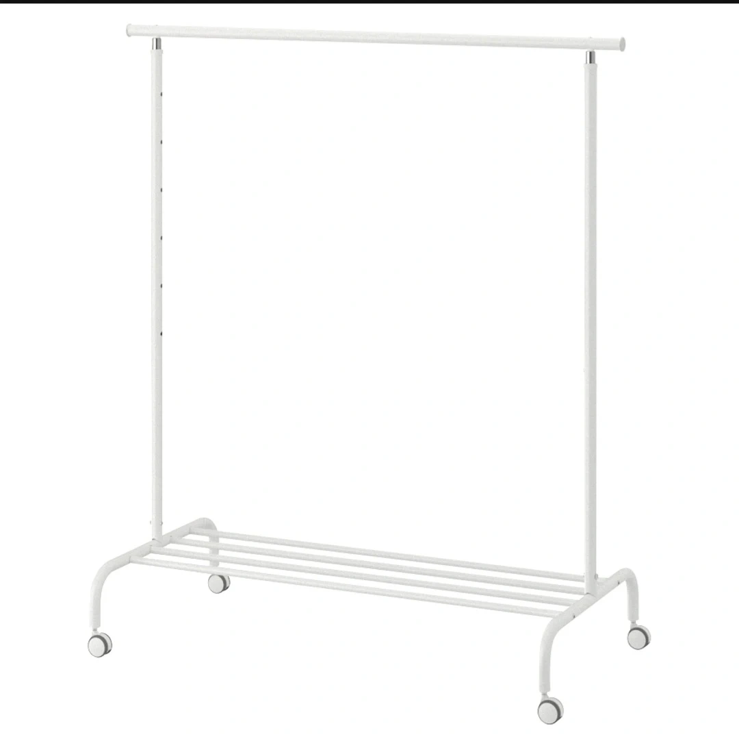 This white IKEA RIGGA clothes rack is on wheels for easy movement. It's 111 cm (43 5/8") wide and adjustable in height from 104 cm (41") to 155 cm (61").