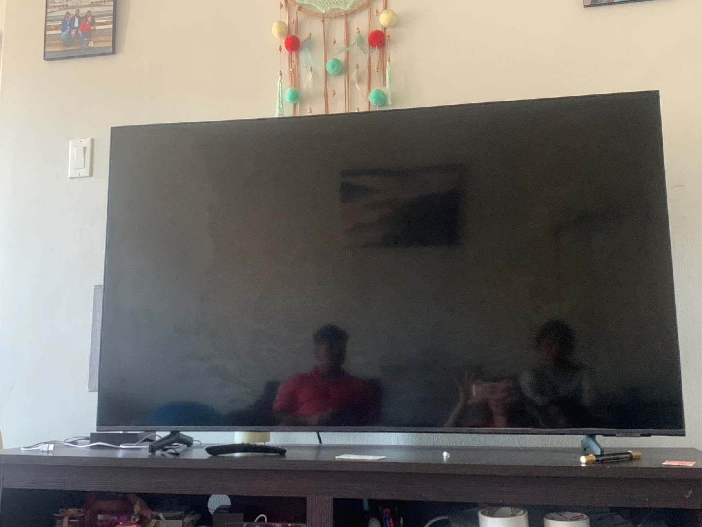 Samsung 55” QLED Smart TV. It's a large display, perfect for a living room or entertainment space. Includes a power cord and remote. Serious inquiries only.