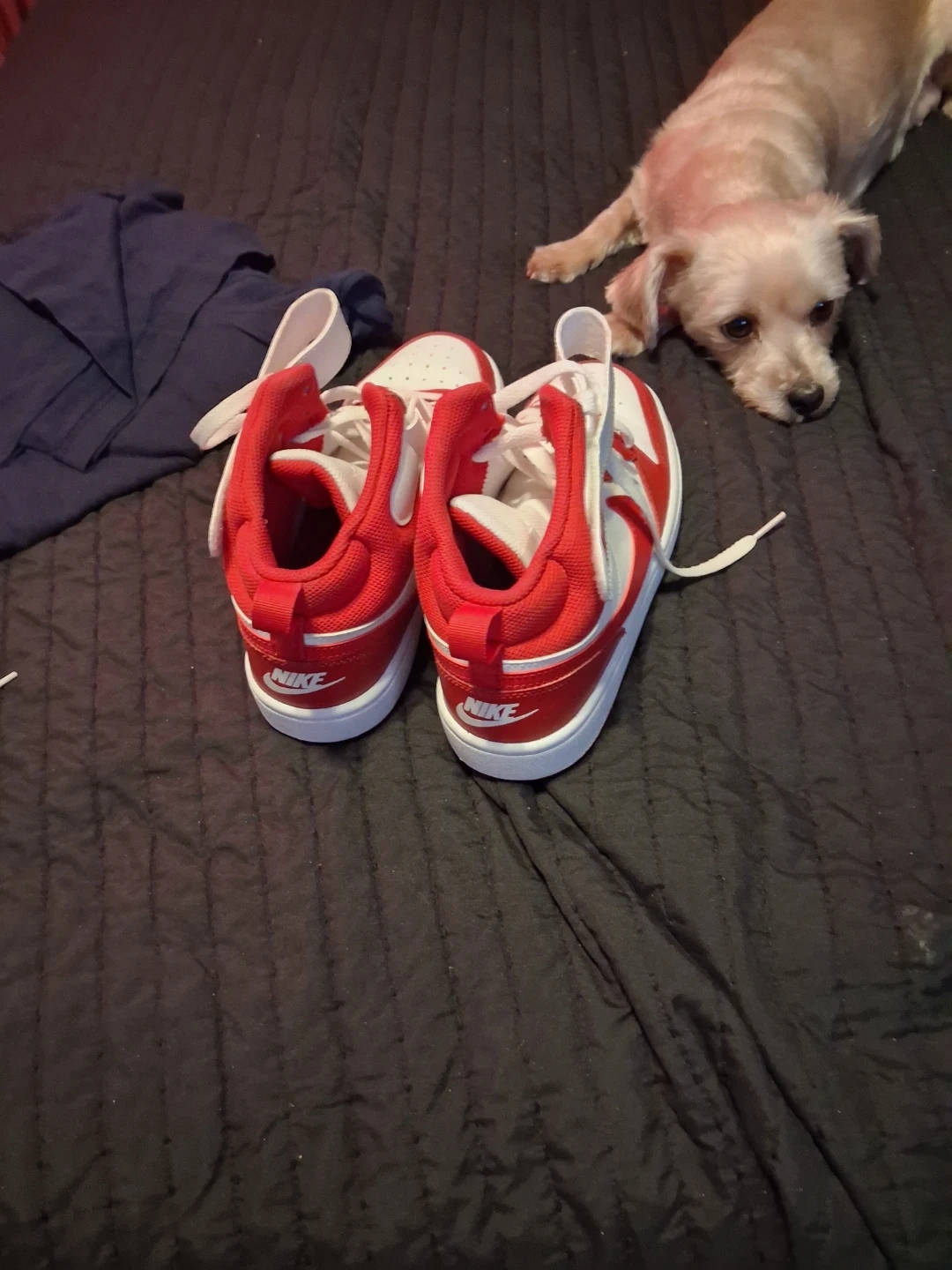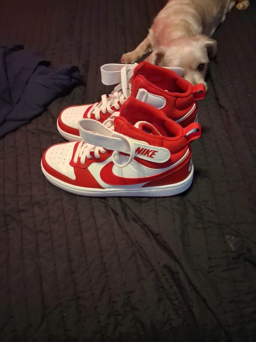 Nike Court Vision Mid kids' shoes in red and white. High-top design with velcro strap closure. Perfect for active youngsters! Size 6.5 youth is wore 2x.