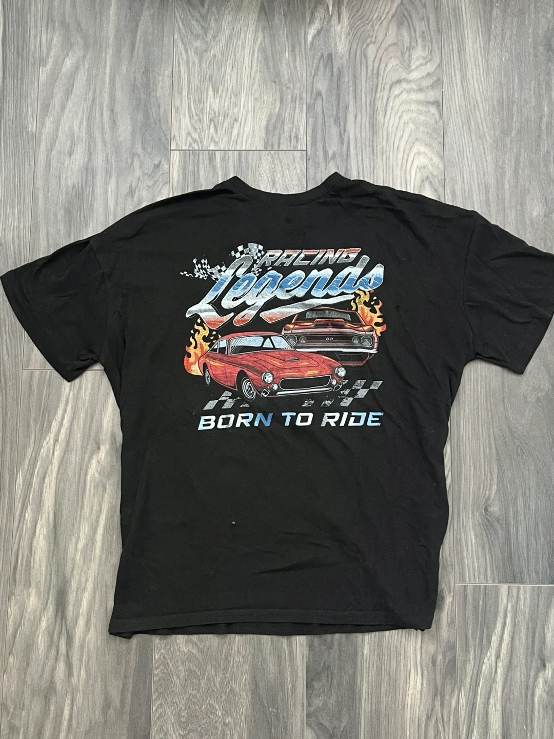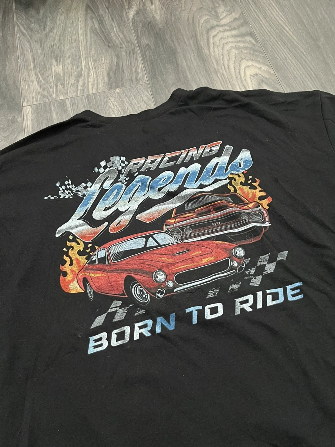 Simple black graphic t-shirt. Reads “Racing Legends Born To Ride”. Made from natural cotton fibre. Some signs of wear. From Streetwear Society.