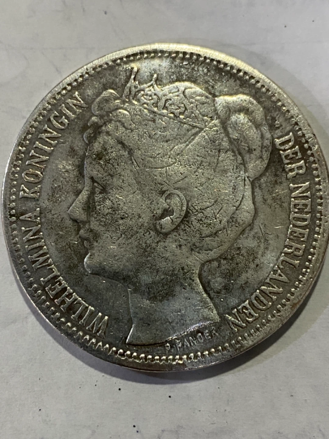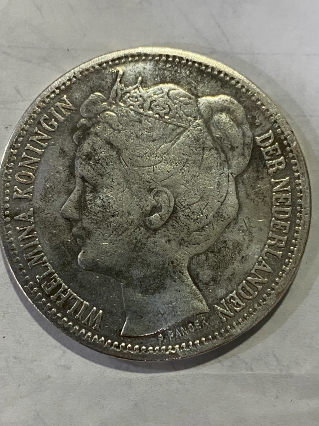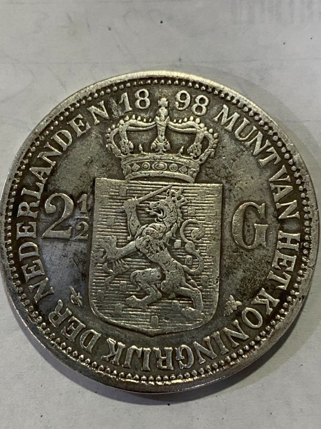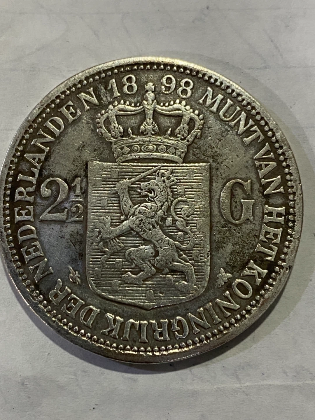 Vintage Netherlands silver 2 1/2 Gulden coin from 1898. Features Queen Wilhelmina on one side and the Dutch coat of arms on the other. A nice piece for collectors!