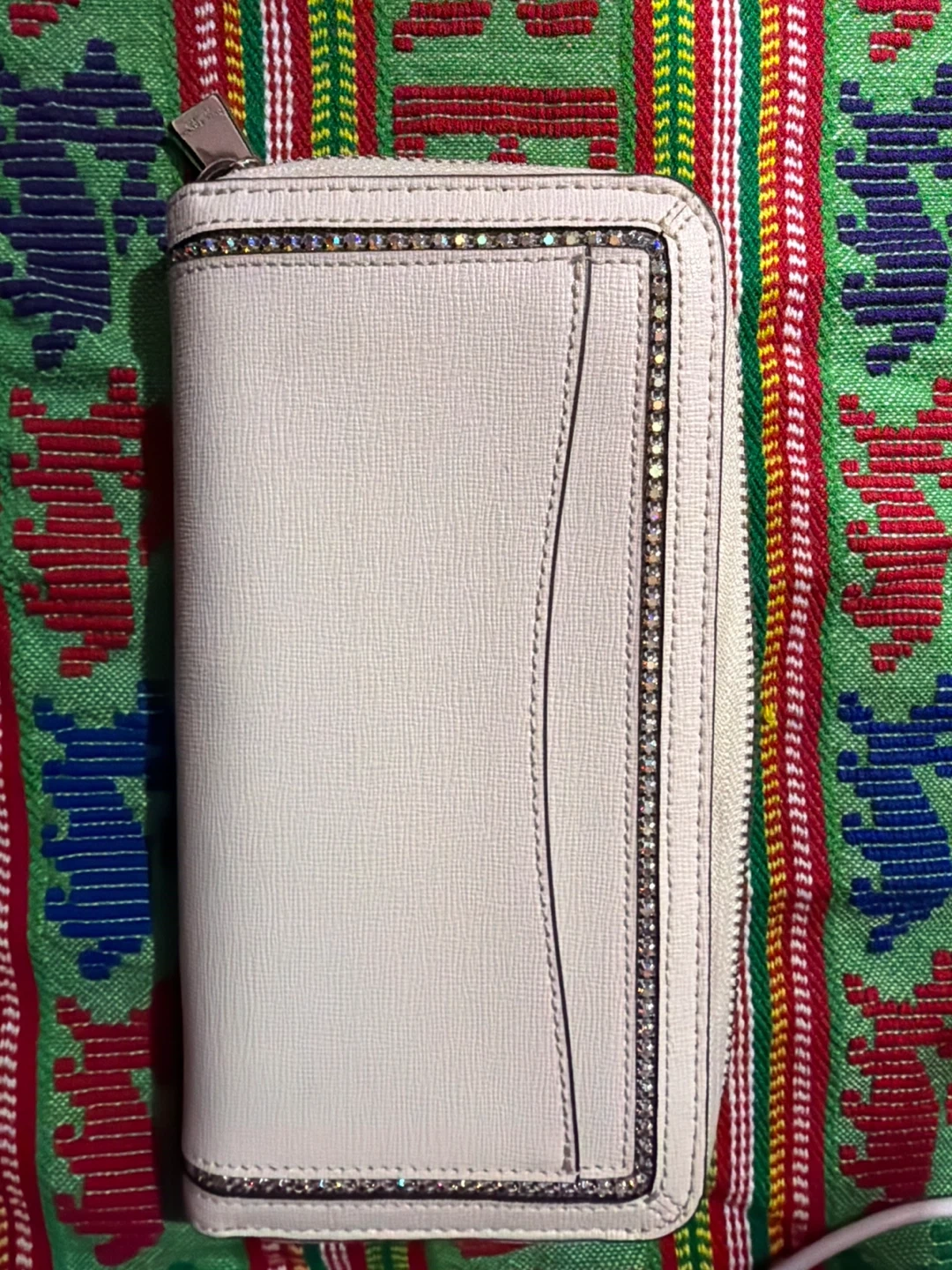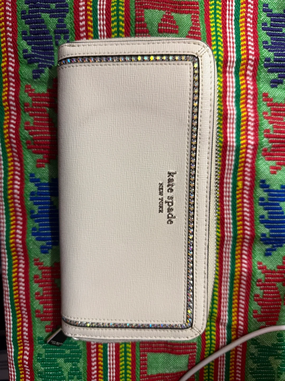 White Kate Spade zip around wallet with silver hardware. It has multiple card slots and a zippered coin pocket. This wallet's exterior is embellished with subtle rhinestones.
