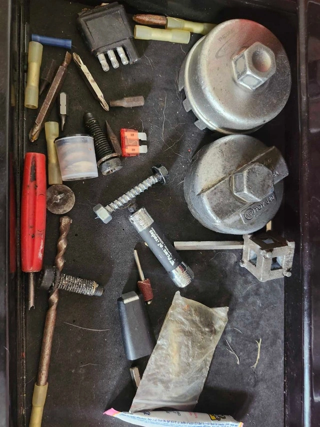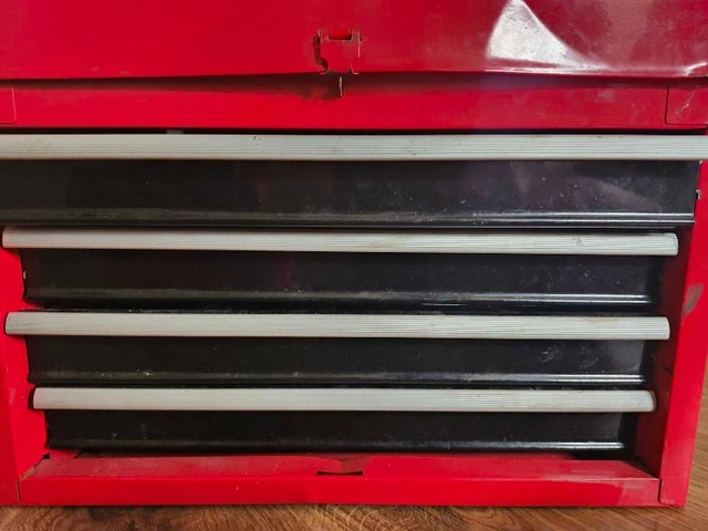 Red metal 4-drawer tool chest. It's filled with various tools including sockets, wrenches, pliers, and a small saw. Some tools have brand markings like "MAXIMUM". For Sale By: Owner.