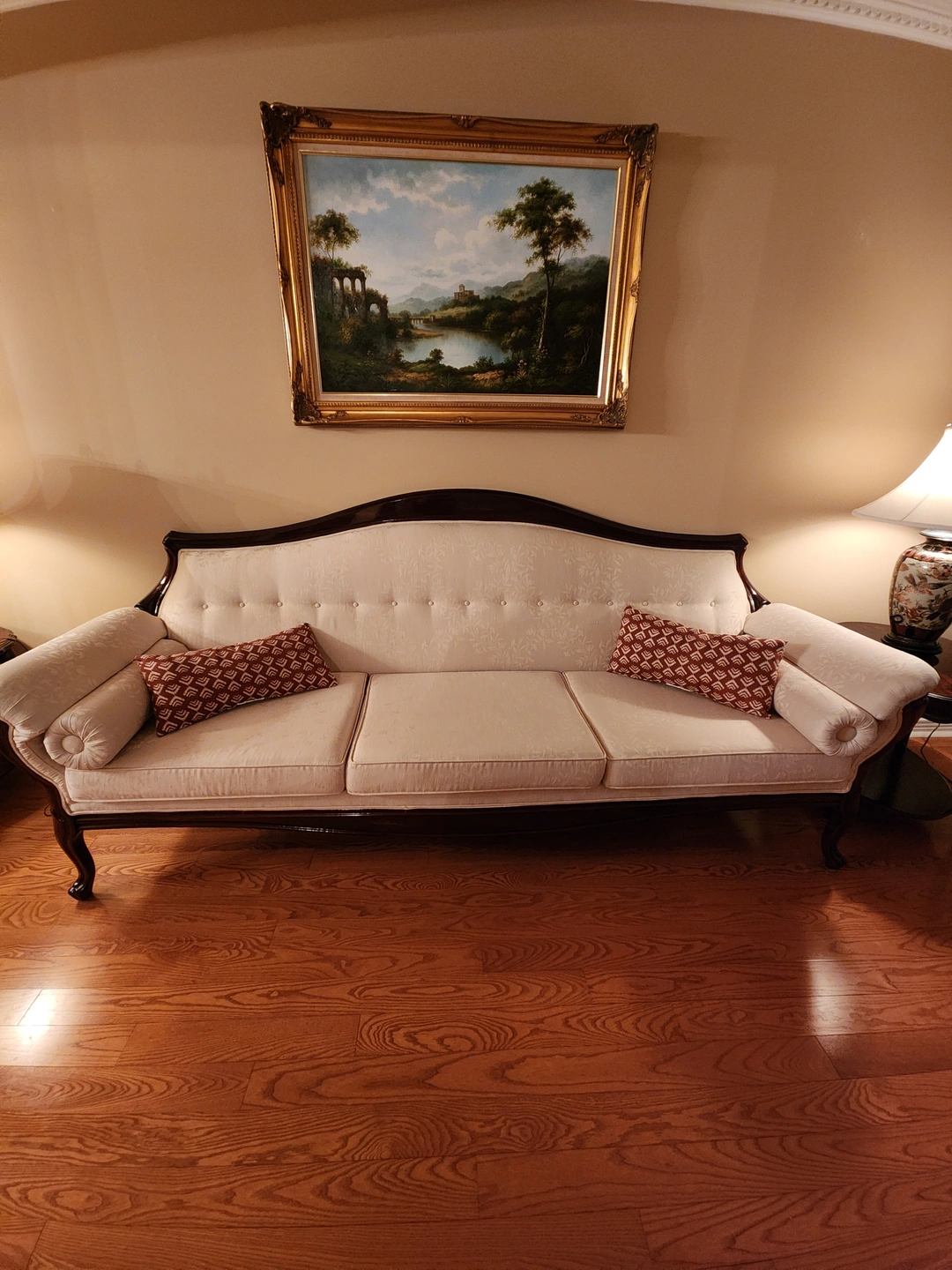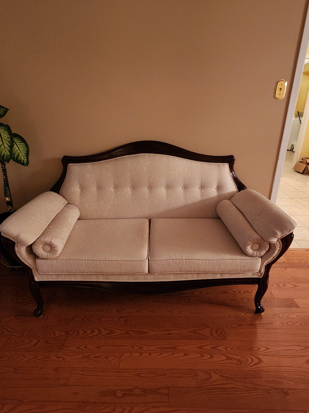 Selling a beautiful antique-style sofa, loveseat, and chair set. The set features a cream-coloured fabric with a subtle floral pattern and dark wood trim. It would look great in any living room!
