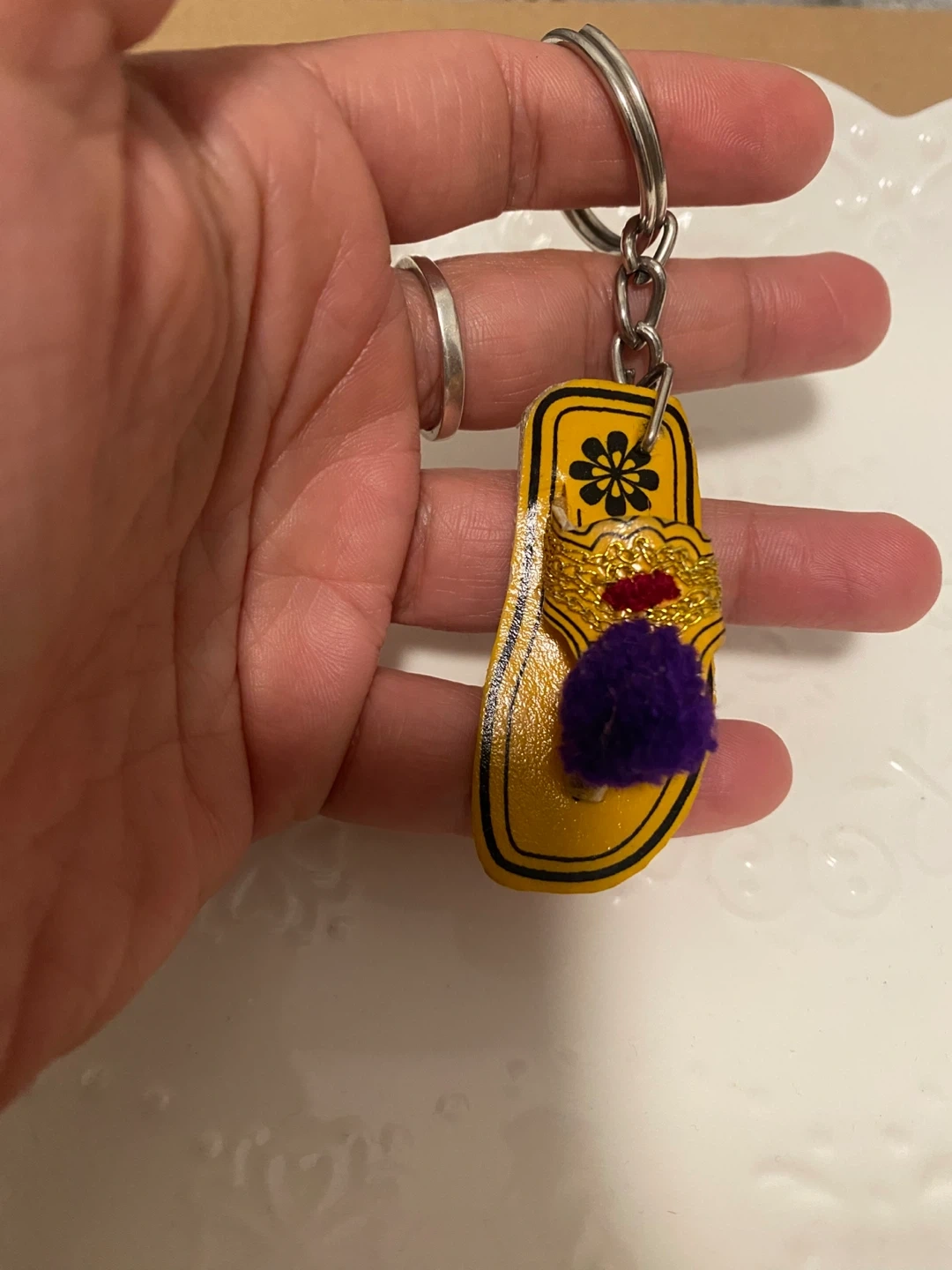 A fun keychain shaped like an ethnic yellow flip flop with decorative accents. It's a unique accessory to add to your keys or bag. Great for adding a pop of colour!