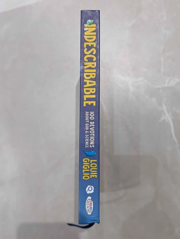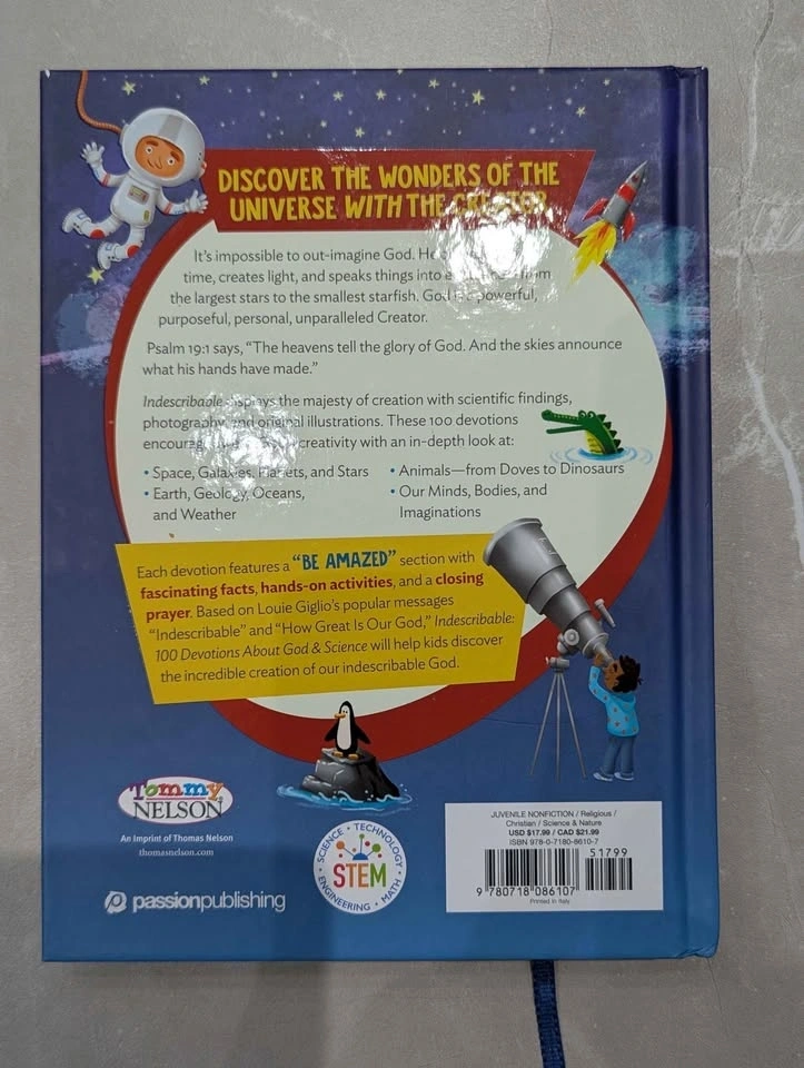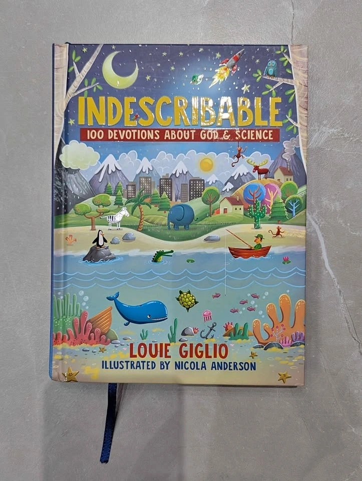 Colorful book, Indescribable by Louie Giglio. Has 100 devotions about God & Science. Great for kids. Has a ribbon bookmark. Pickup in Nobleton.