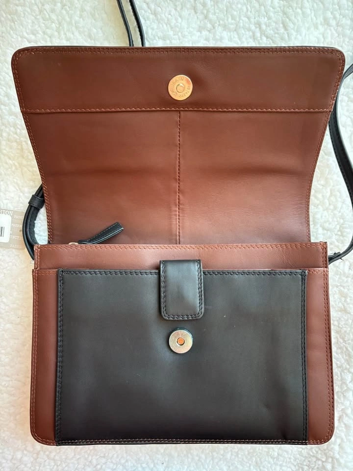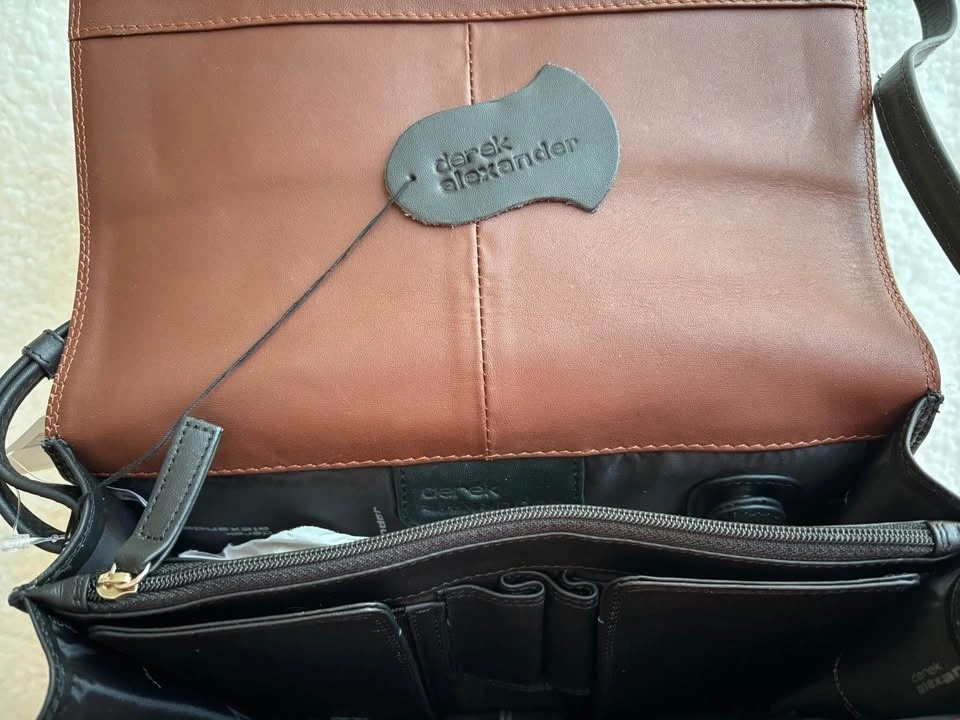 Brand new with tags. Derek Alexander unisex organizer crossbody bag in black/brown leather. Dimensions are 24x17x6-8 cm (expandable). Feel free to message if you have any questions!