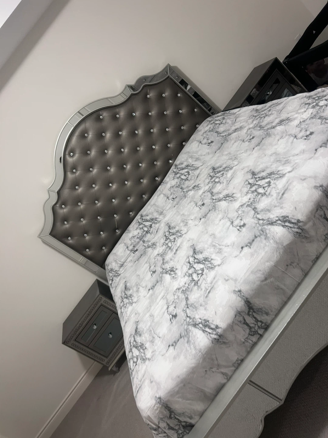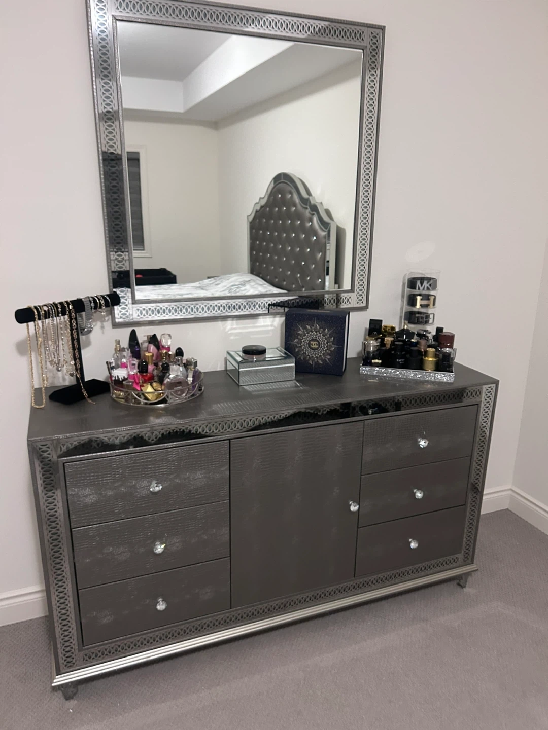 A stylish bed frame featuring a tufted, crystal-embellished headboard with mirrored trim. Includes a matching dresser with a large mirror and crystal drawer pulls. Perfect for a chic bedroom setup!