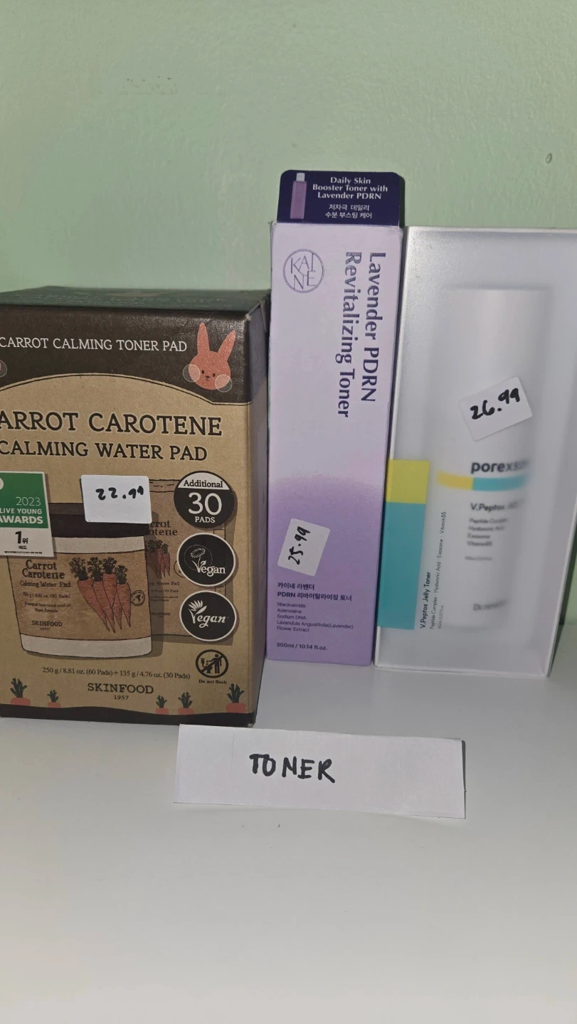 Two toners included: SKINFOOD Carrot Carotene Calming Water Pad and KALNE Lavender PDRN Revitalizing Toner. The SKINFOOD pads are 250g (60 pads) plus an additional 135g (30 pads). The KALNE toner is 300ml. Both are vegan friendly.