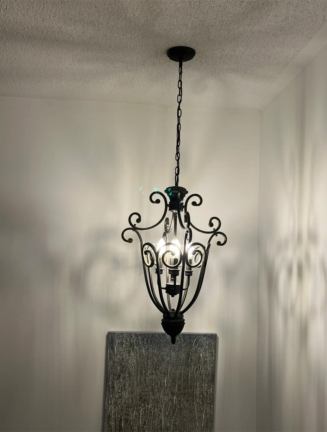 This black metal chandelier adds a touch of classic elegance to any room. It features ornate scrollwork and holds four bulbs for ample lighting. Its design makes it suitable for entryways or dining areas. 24”L, inside diameter 11”, outside diameter 18”