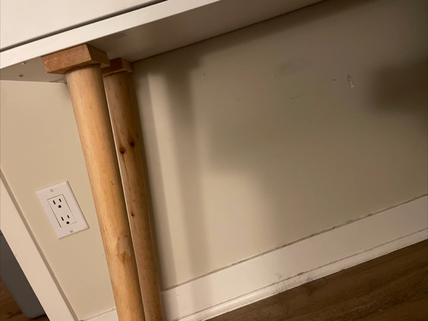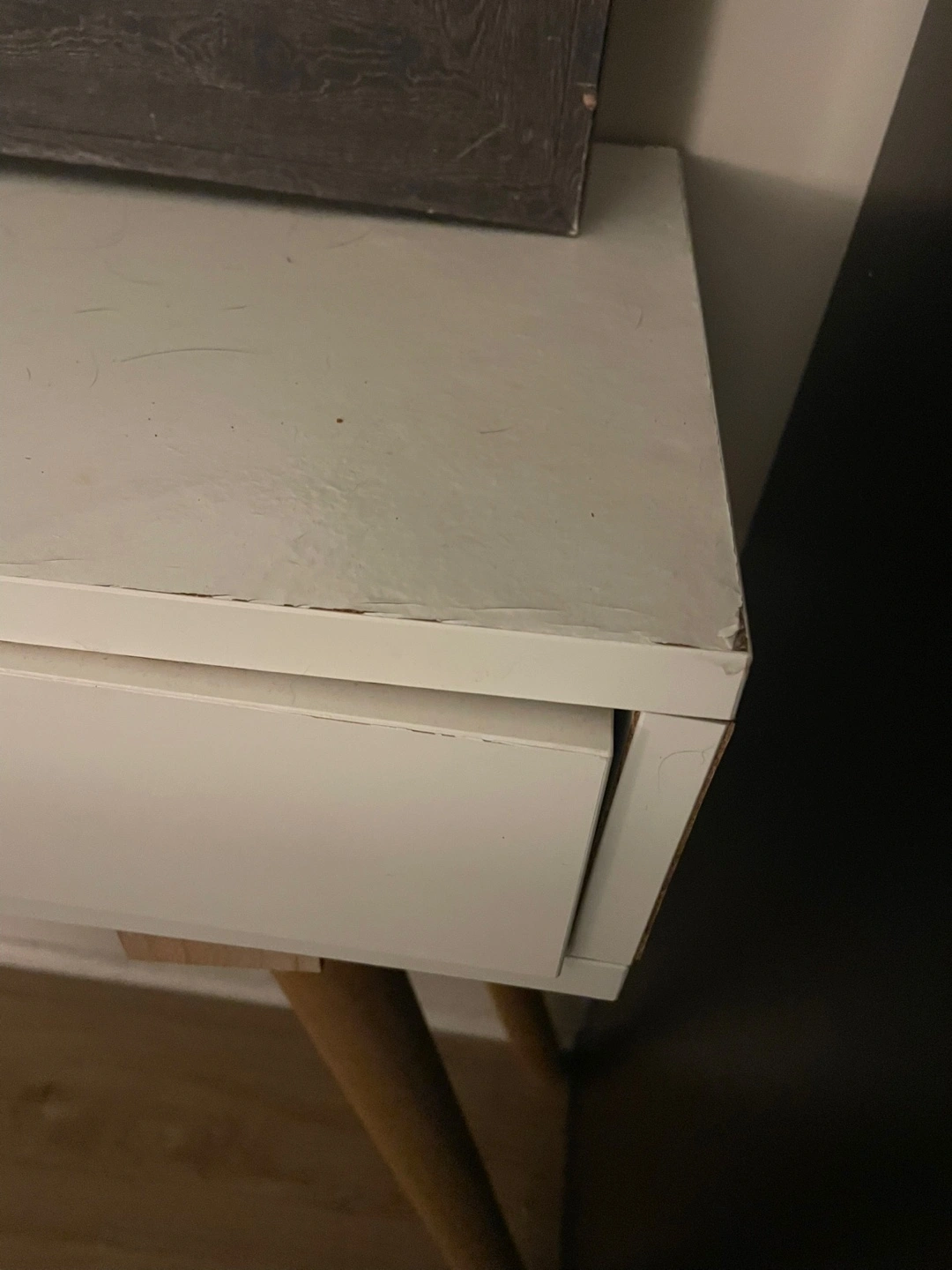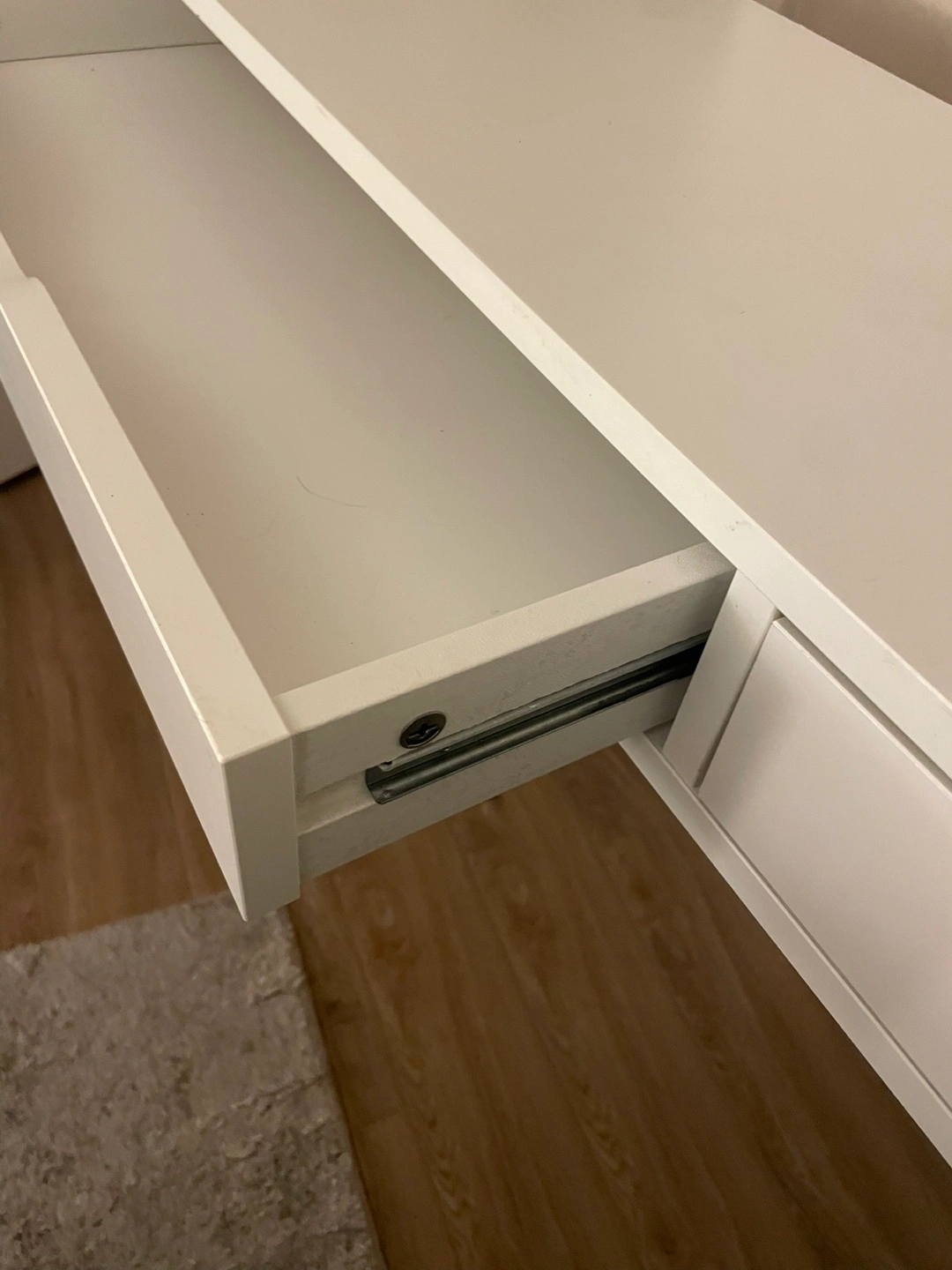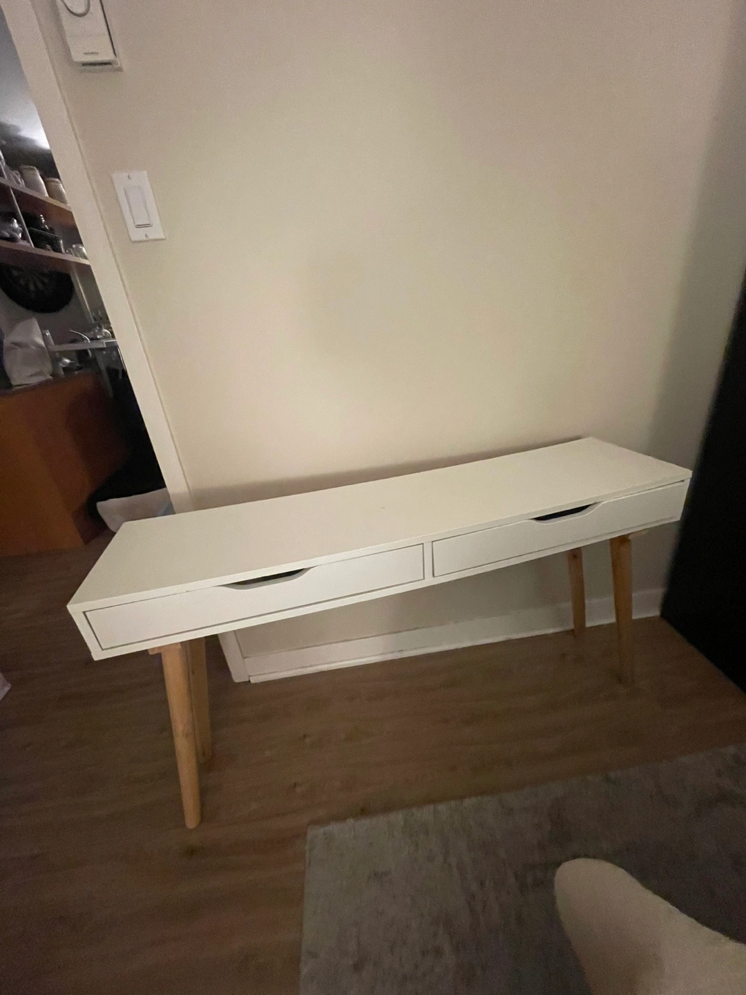 Selling a white vanity desk with two drawers. Simple, clean design with wooden legs. Perfect for a bedroom or dressing area! Little bit wobbly due to the length of the legs and how narrow it is