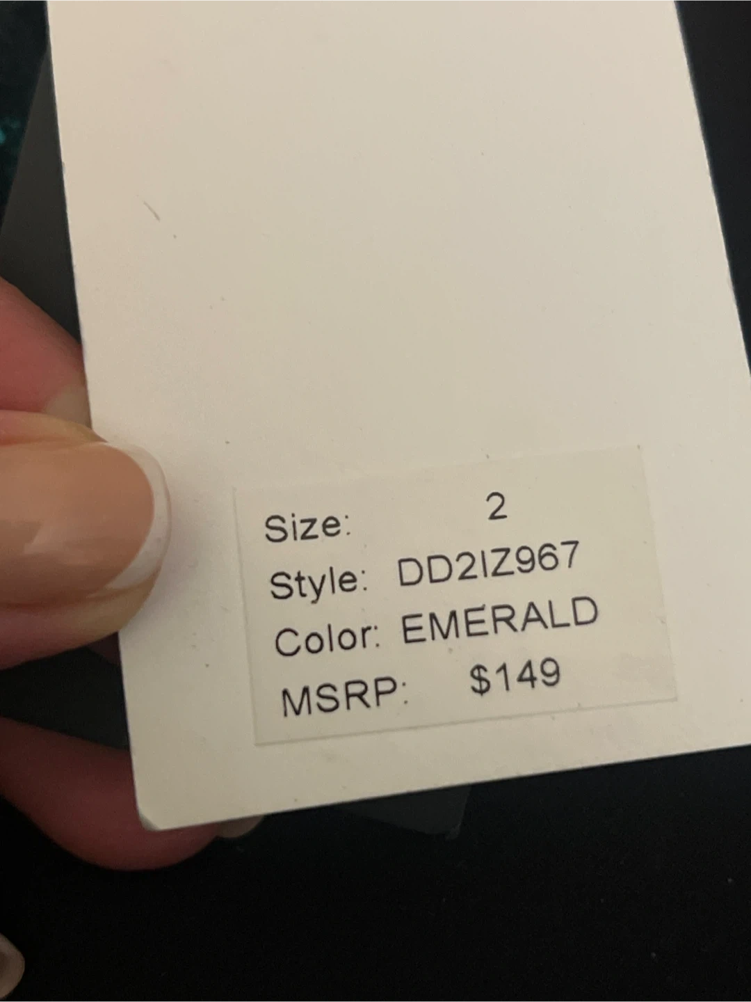This DKNY dress is a showstopper! It's a beautiful emerald green with sequins that catch the light. It's a size 2 and has a flattering wrap style. The style number is DD2IZ967. The dress originally retailed for $149