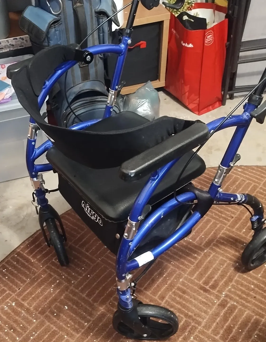 Blue walker with seat and storage basket. It's made of lightweight aluminum. This walker has easy-grip handles and brakes. It's useful for those needing extra support when walking.