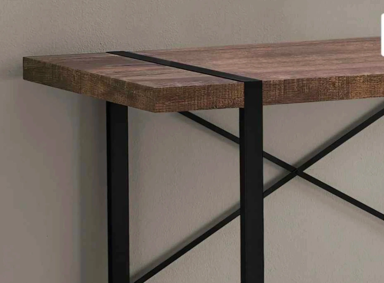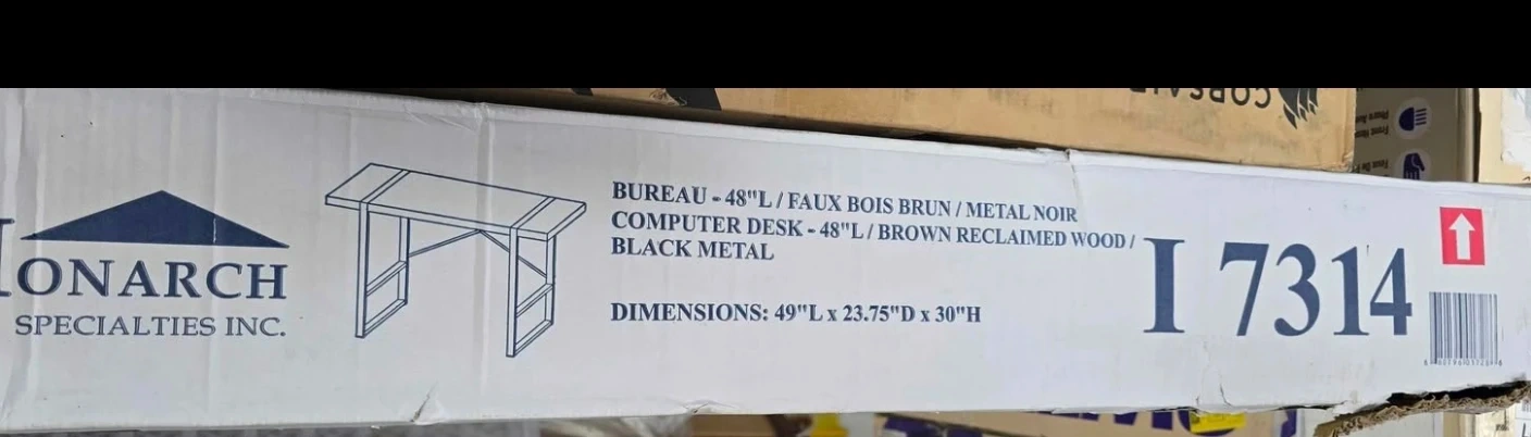 I have brand new in box Monarch computer desk. This computer desk is 49" L x 23.75" D x 30" H. It's constructed with a brown reclaimed wood look top and a black metal frame. The desk is 2 inches thick on top.