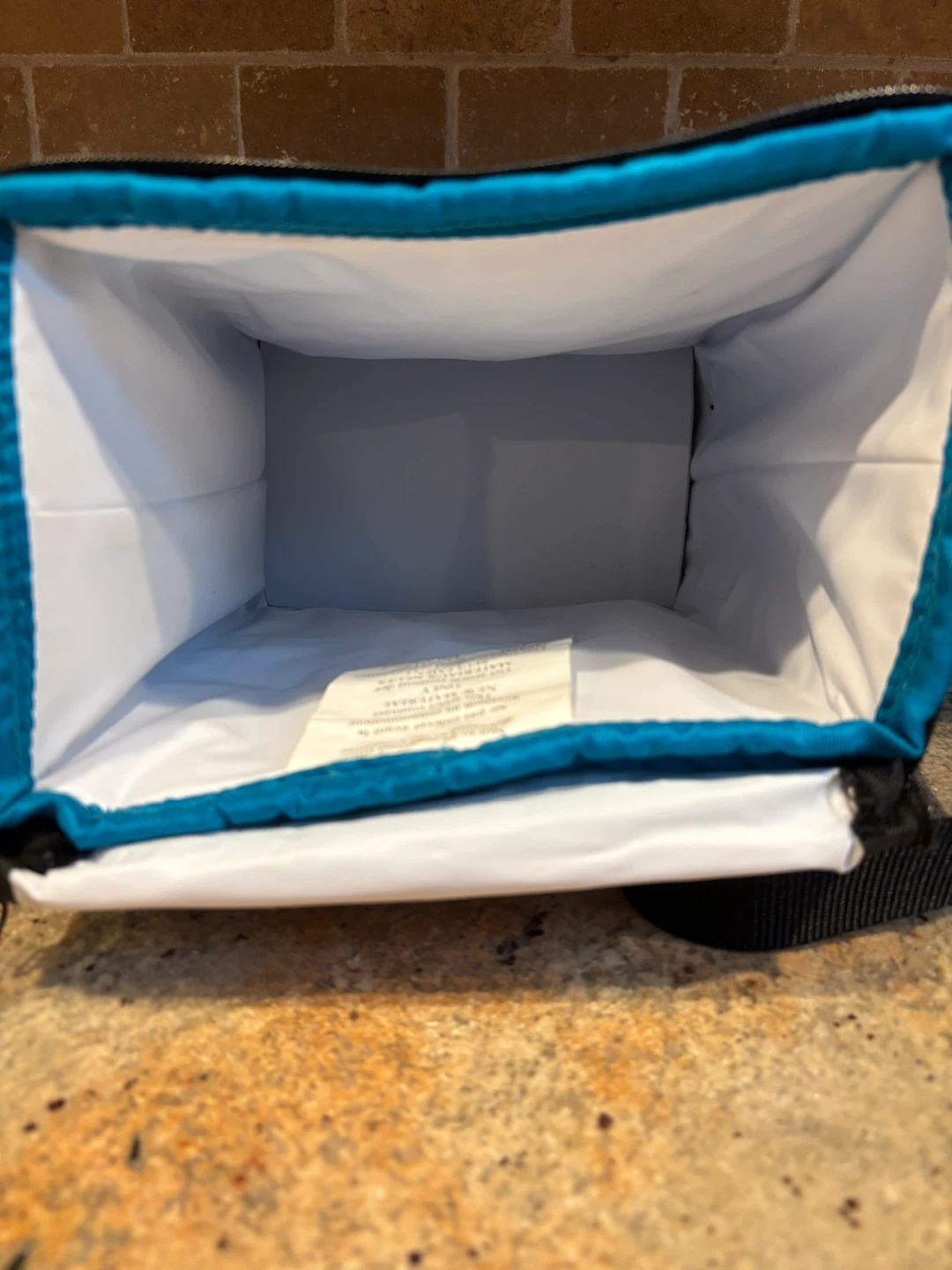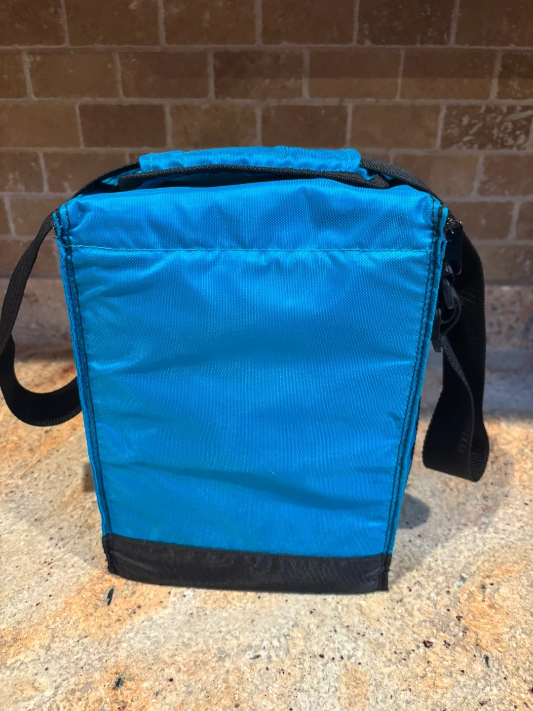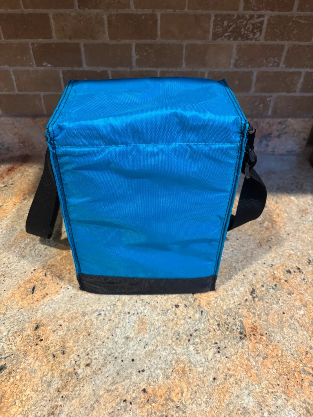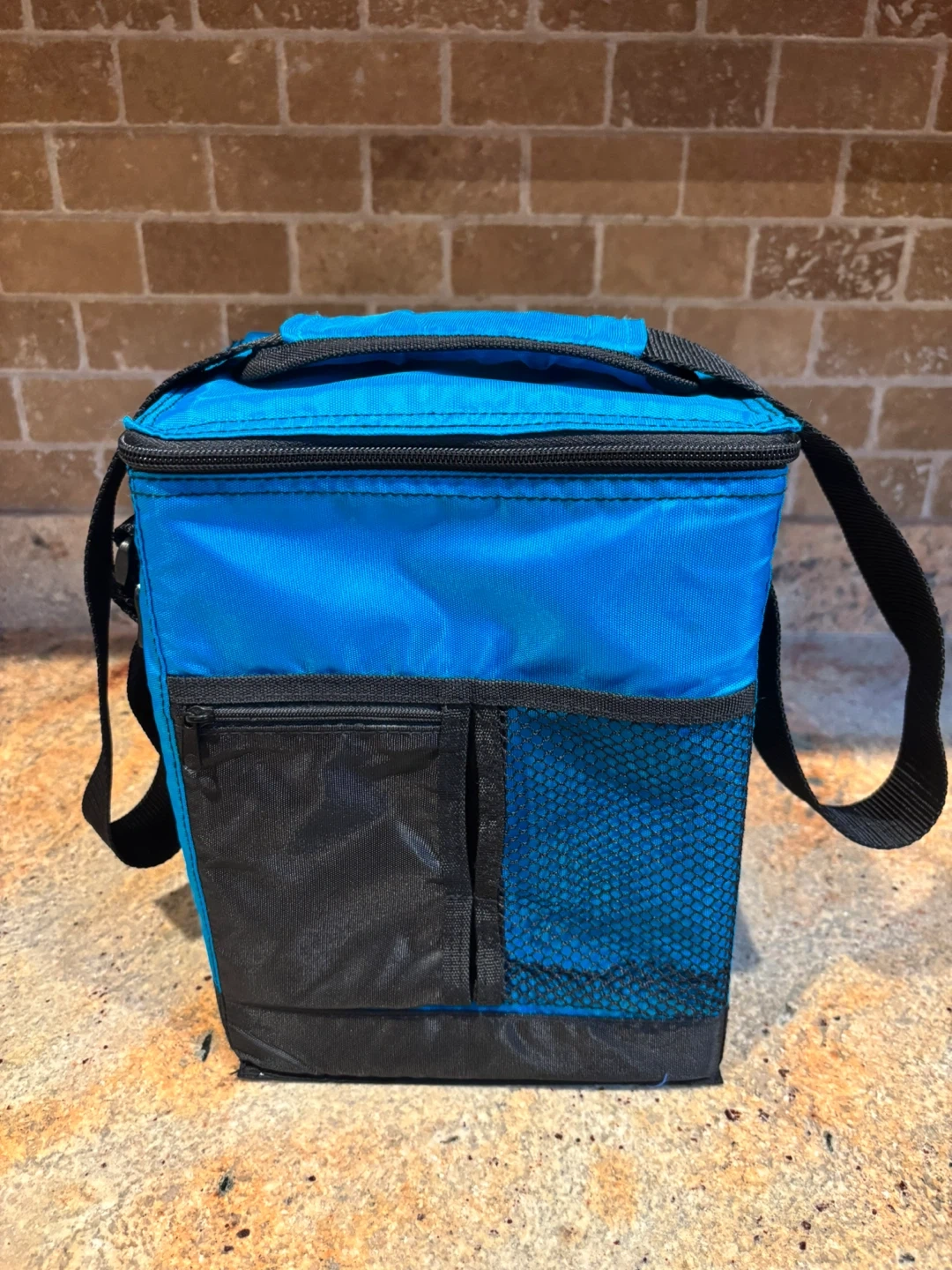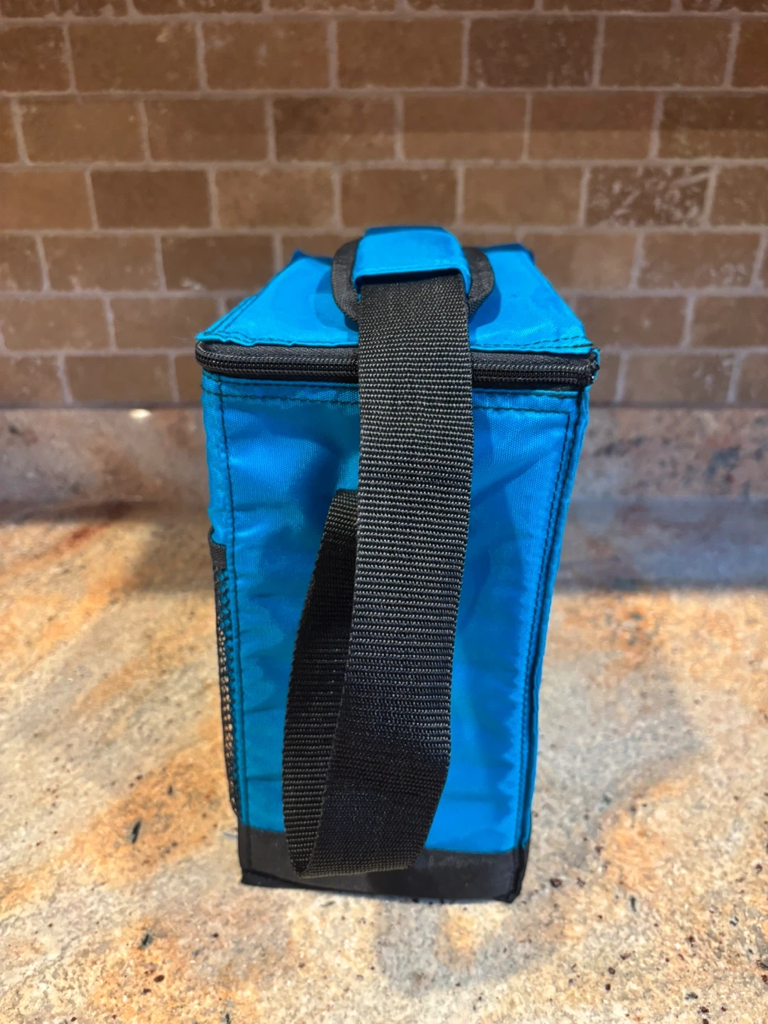Here's a handy blue insulated lunch bag! It's great for keeping your food and drinks cool on the go. It features a convenient shoulder strap and some handy pockets on the front and side!