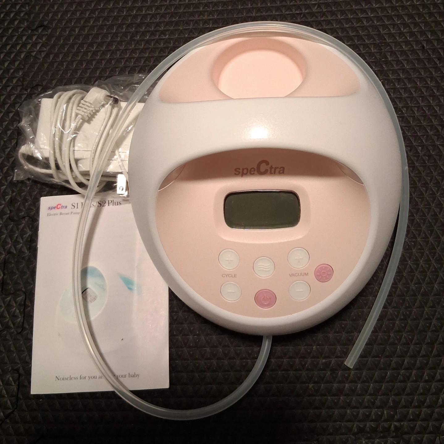 This Spectra S1 Plus electric breast pump is white and pink. It includes the pump, power adapter, and an instruction manual. It's designed to be quiet for discreet use.