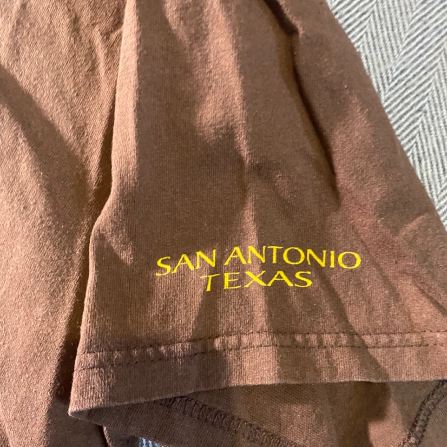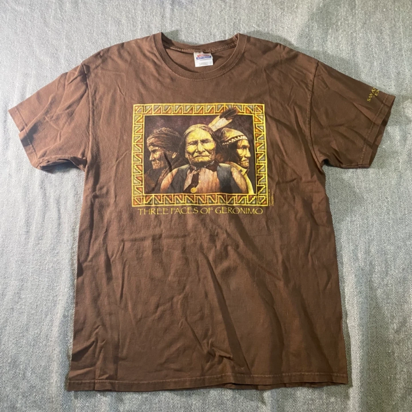 Brown Hanes Heavyweight t-shirt with a "Three Faces of Geronimo" graphic on the front. It's 100% preshrunk cotton and made in Mexico. Adult size large (42-44).