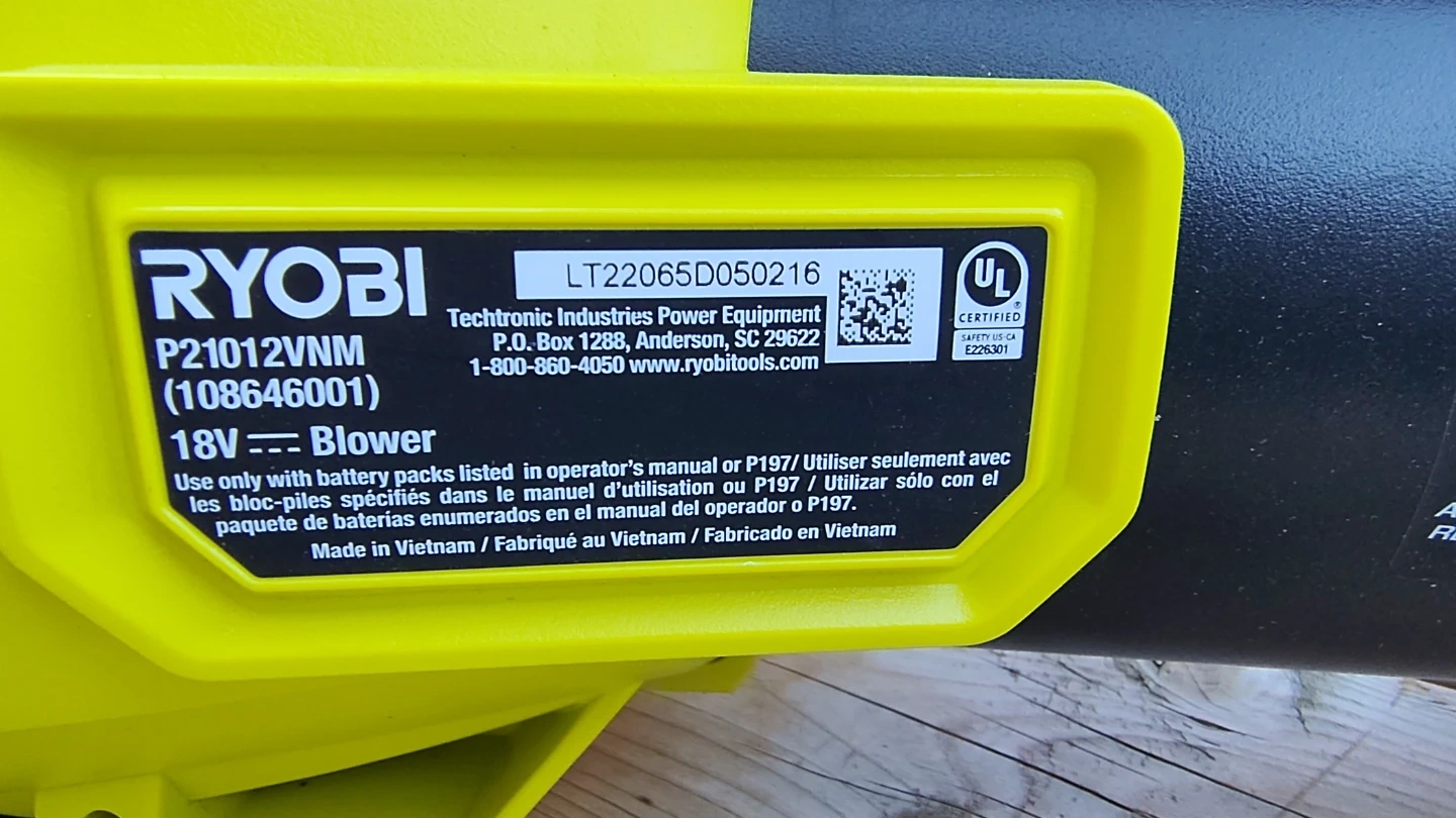 Used Ryobi 18V Cordless Blower, model P21012VNM. Part of the Ryobi ONE+ system. The condition is good, fully fuctional. Blower comes WITHOUT battery. Any Ryobi 18V battery will fit.