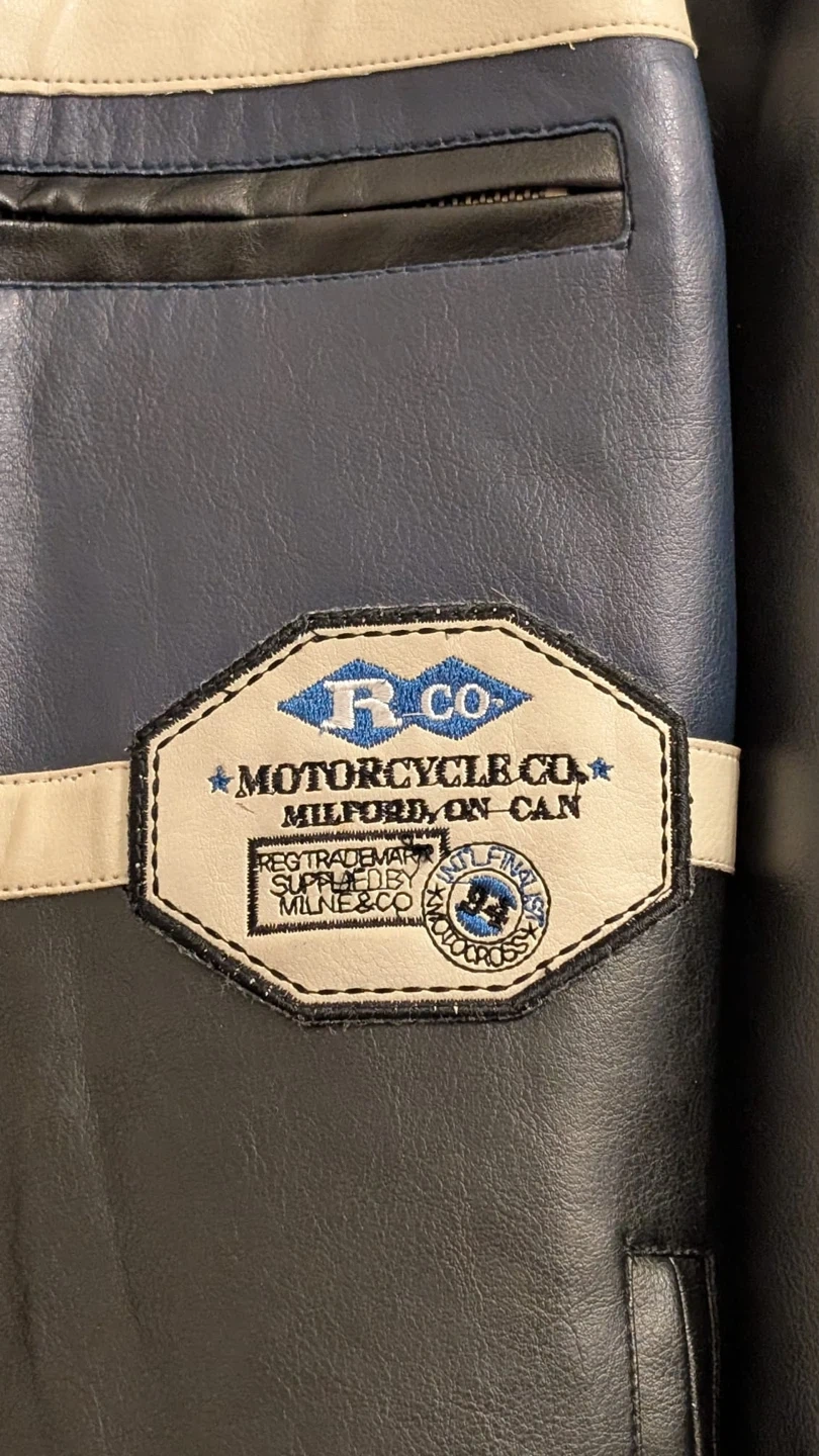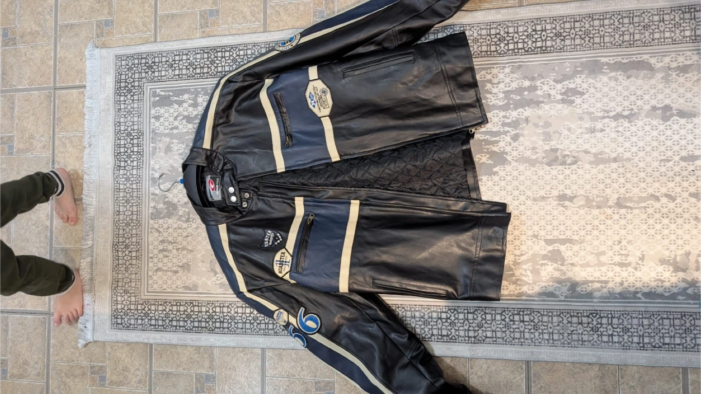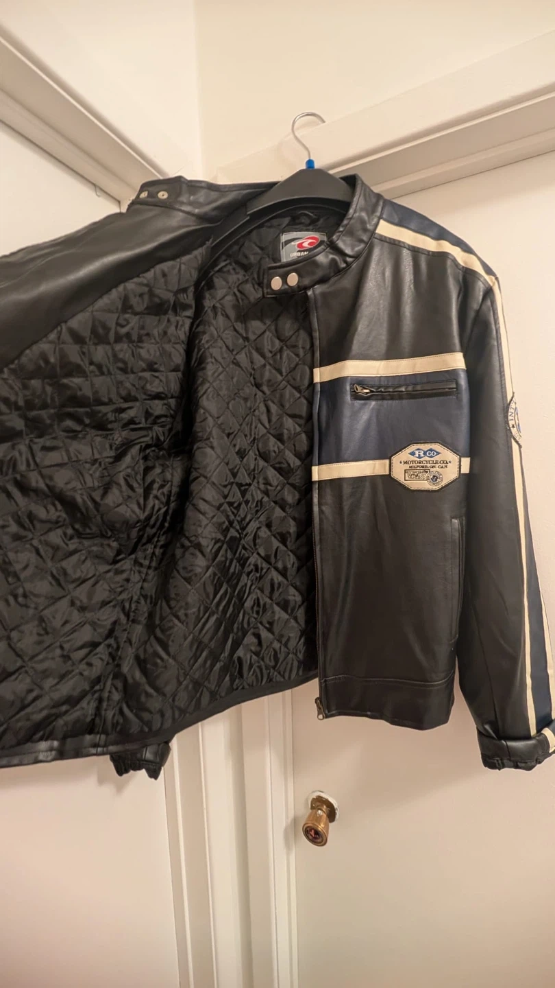 Selling a stylish black leather jacket from Urban Rags. It's a size XL/TG. The jacket has a cool design with stripes and patches, giving it a unique look!