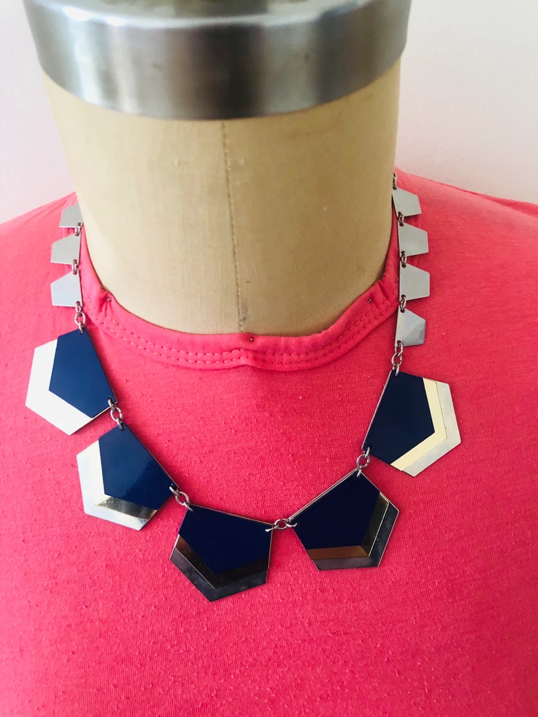 A striking geometric statement necklace from Express. It features a mix of navy blue, silver, and gold-tone metal accents. The necklace has a lobster clasp closure.