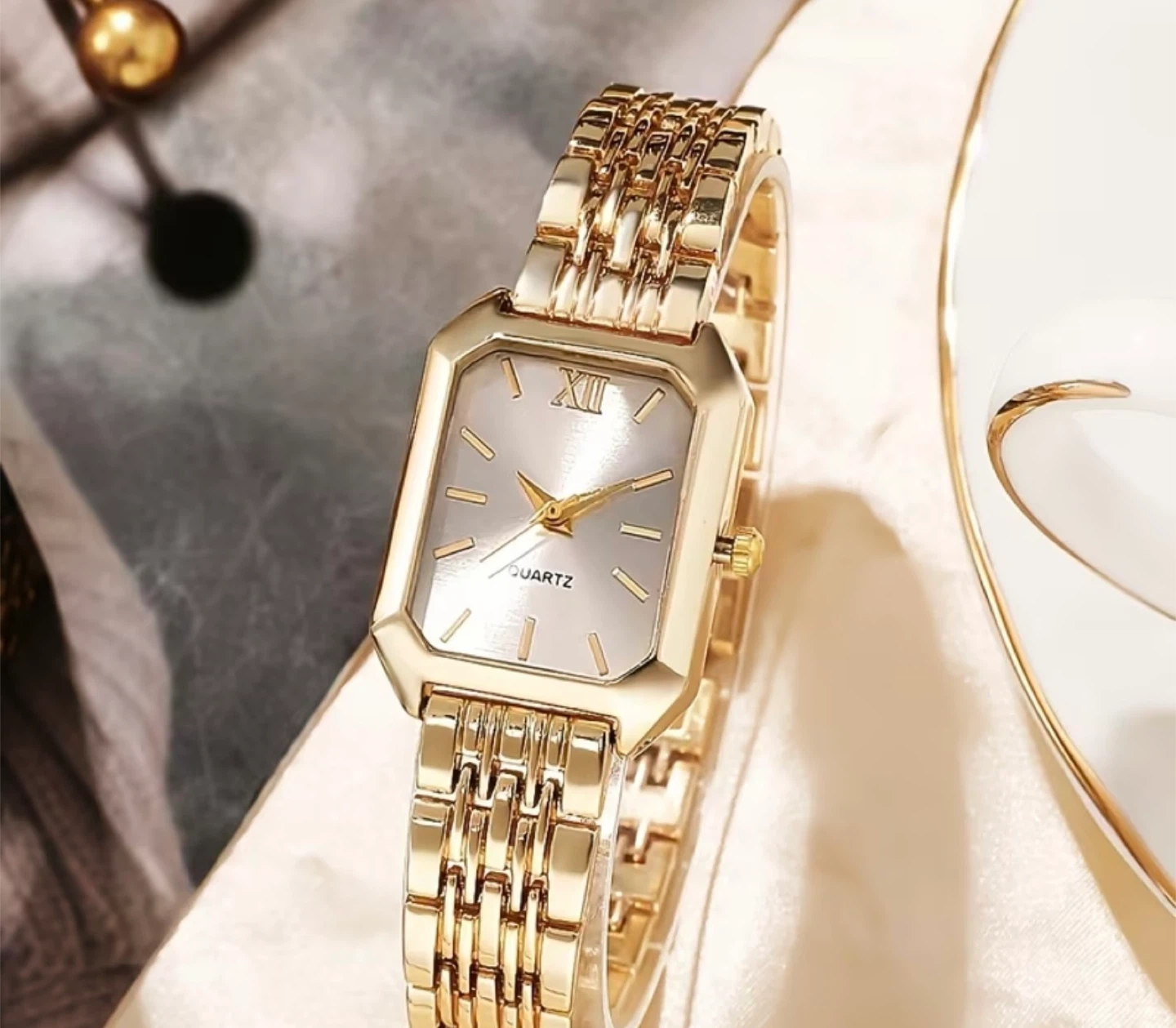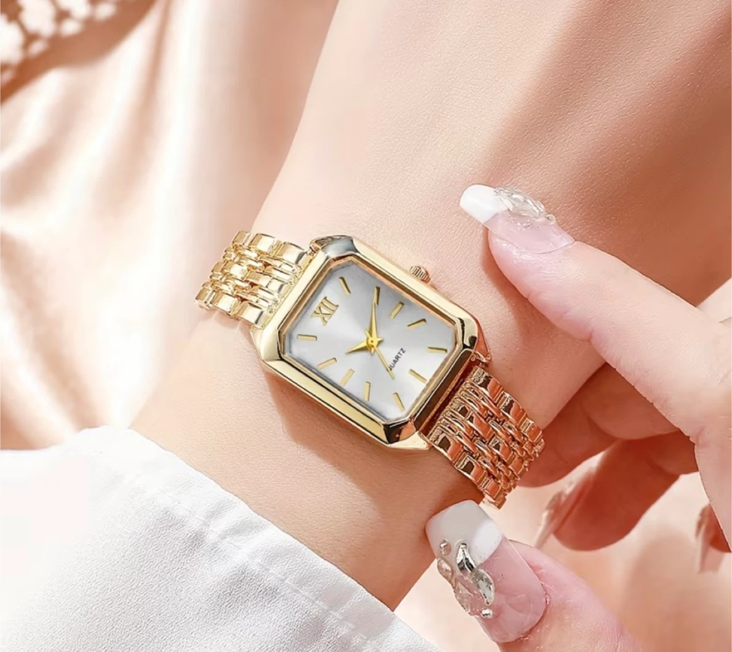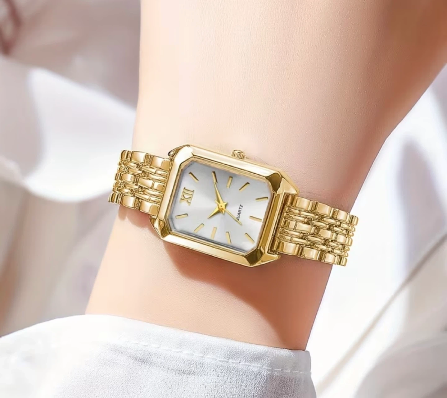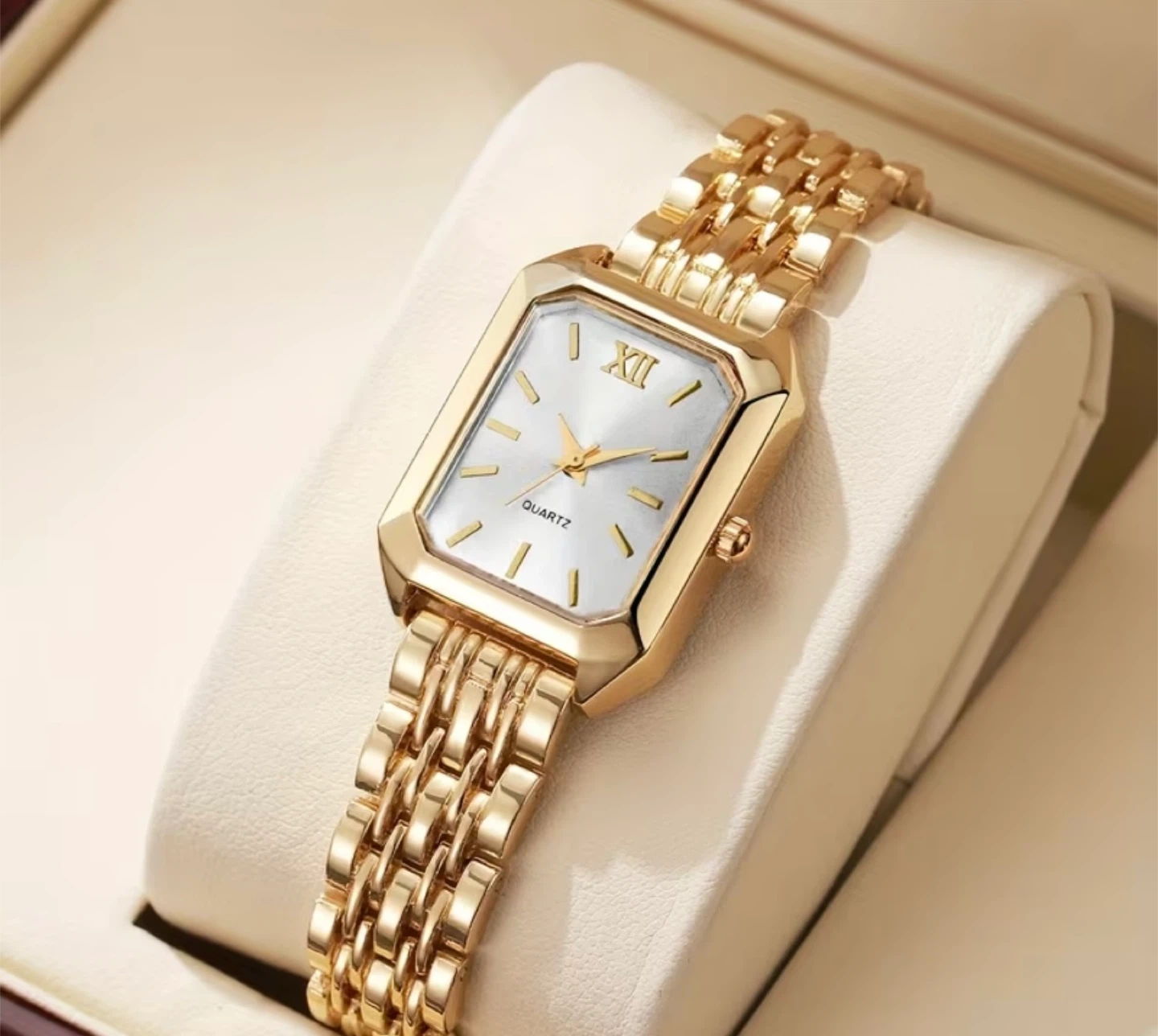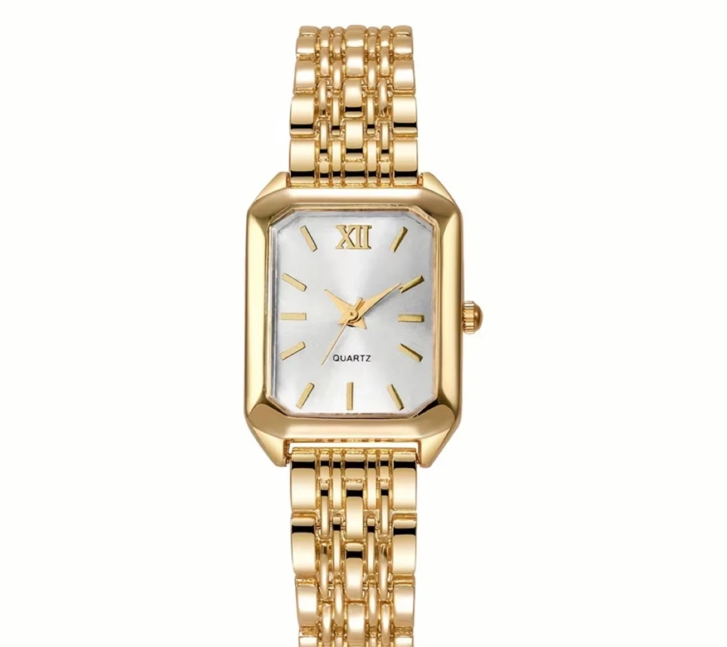 This gold-tone watch features a rectangular face with Roman numerals at the 12 o'clock position. It has a classic quartz movement and a stylish linked bracelet. It's a beautiful accessory for any occasion!