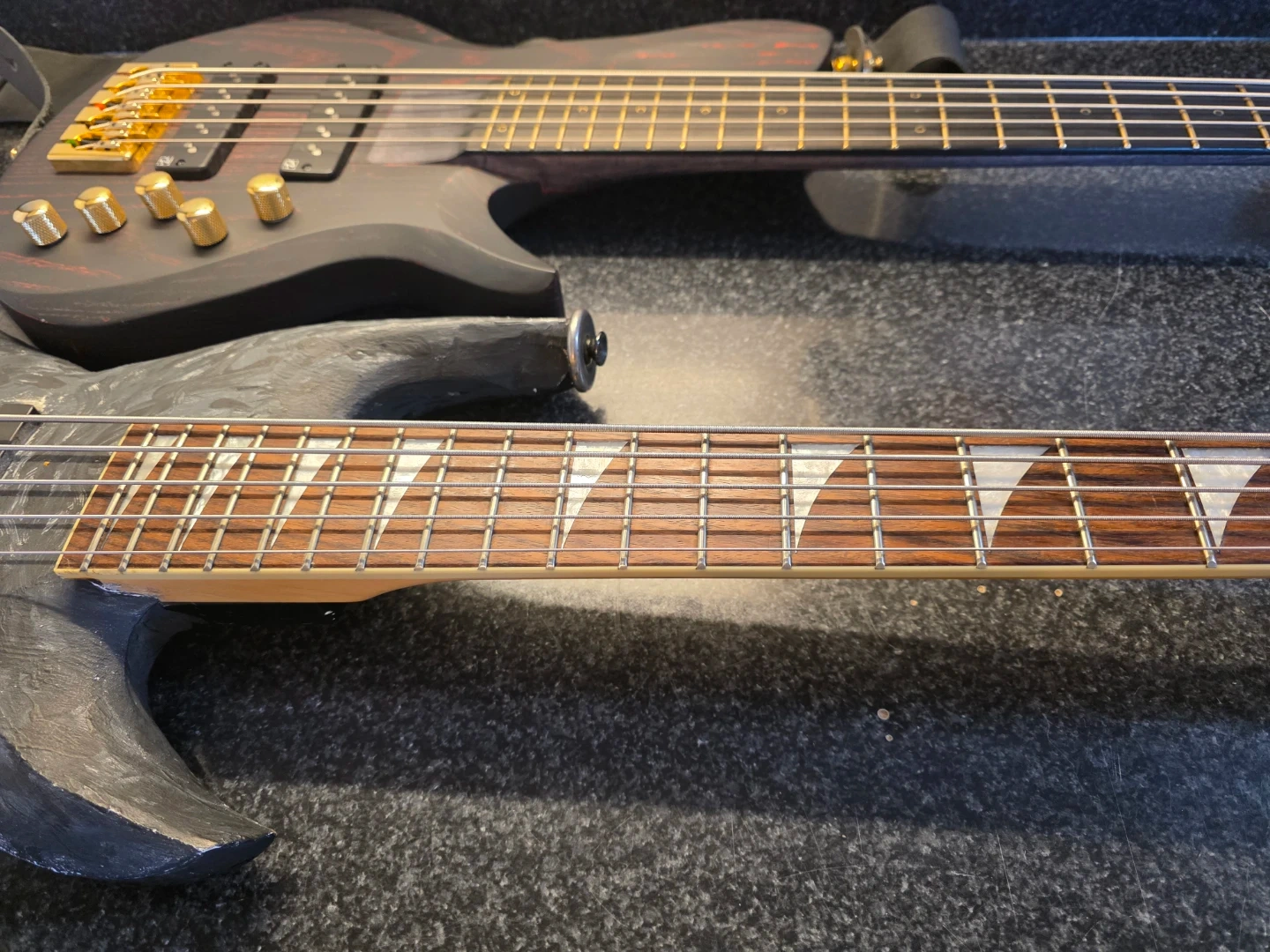 Jackson JS 5 string bass. The body was modified (carved and painted). Good instrument to transition from 4 to 5 strings. EMG HZ pick-ups. Neck and body are maple, fretboard is rosewood. Haven't use it in 4 years. Strings are pretty old.