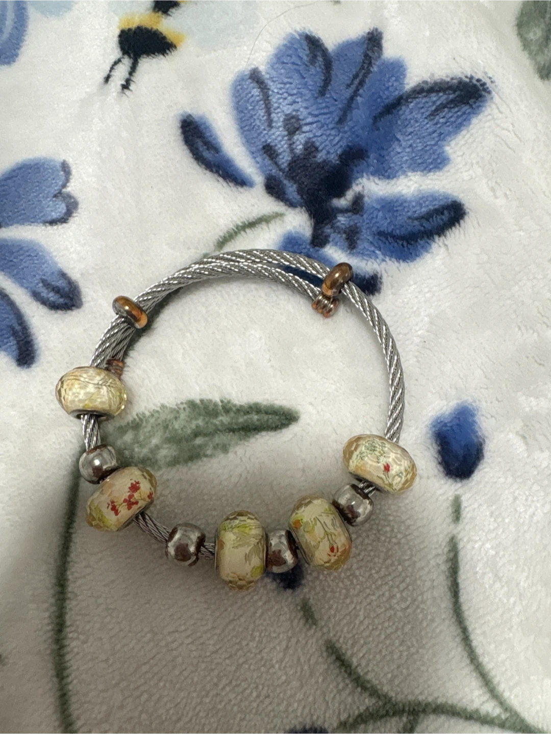 This bracelet features a silver-tone cable wire band adorned with decorative beads. The beads have a light, speckled pattern with subtle floral accents. It's a nice piece for everyday wear. Pick up cash only