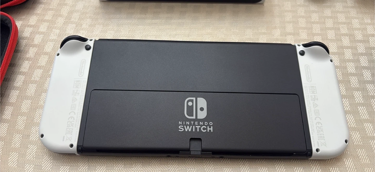 Complete Nintendo Switch OLED model in white. Includes the console, Joy-Cons, dock, grip, AC adapter, and original case. It's ready for gaming fun!