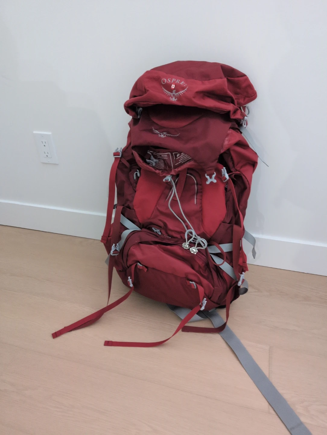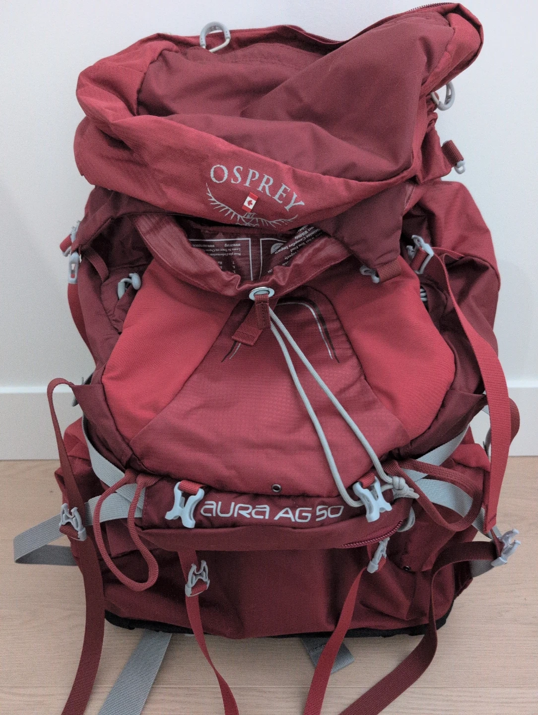 Osprey Aura AG 50 women's backpack in red. Size WXS(36-43cm). Designed with an Anti-Gravity suspension system, making it easier to carry. Comes with ultralight waterproof liner. Like new condition, used once, no longer needed.