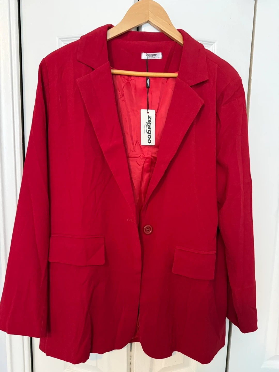 This is a woman’s red blazer from Zeagoo. It's a size XXL and features a classic single-button closure. The material appears to be a lightweight, textured fabric.