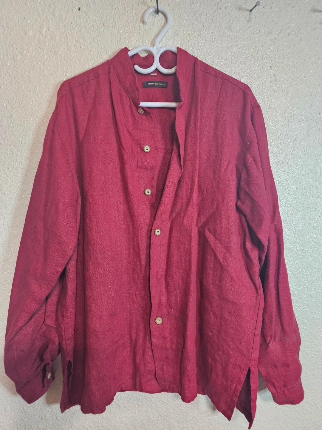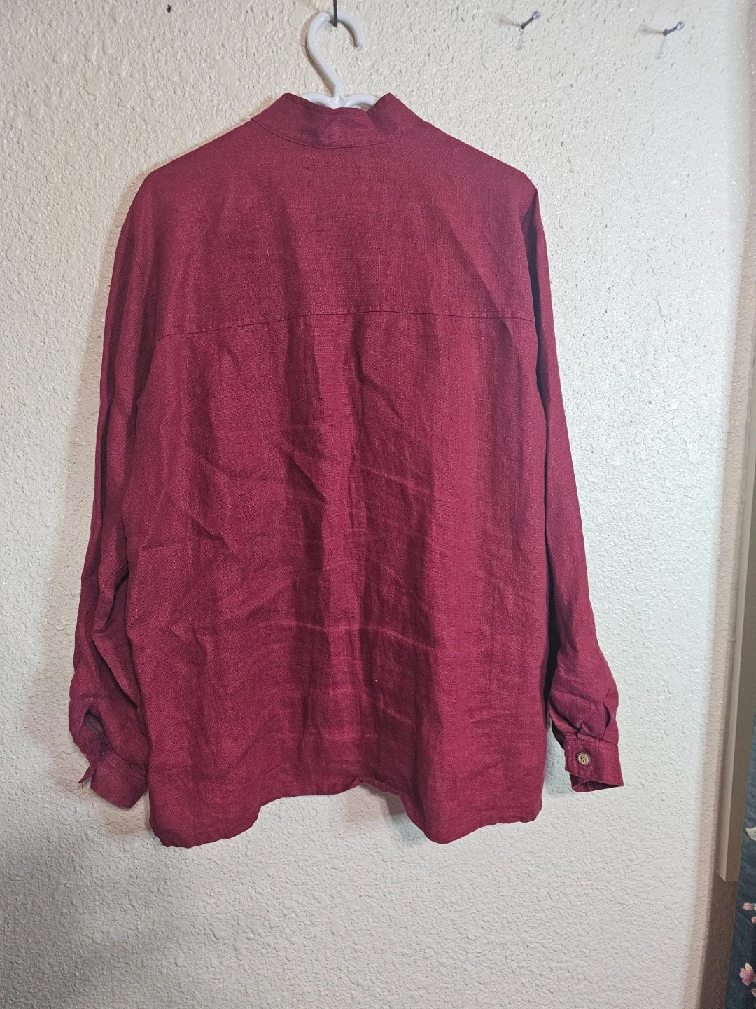 This men's Itsyu Designs shirt is made from a linen blend in a rich burgundy colour. It features a band collar with a button-up front and long sleeves. Size is M/M.