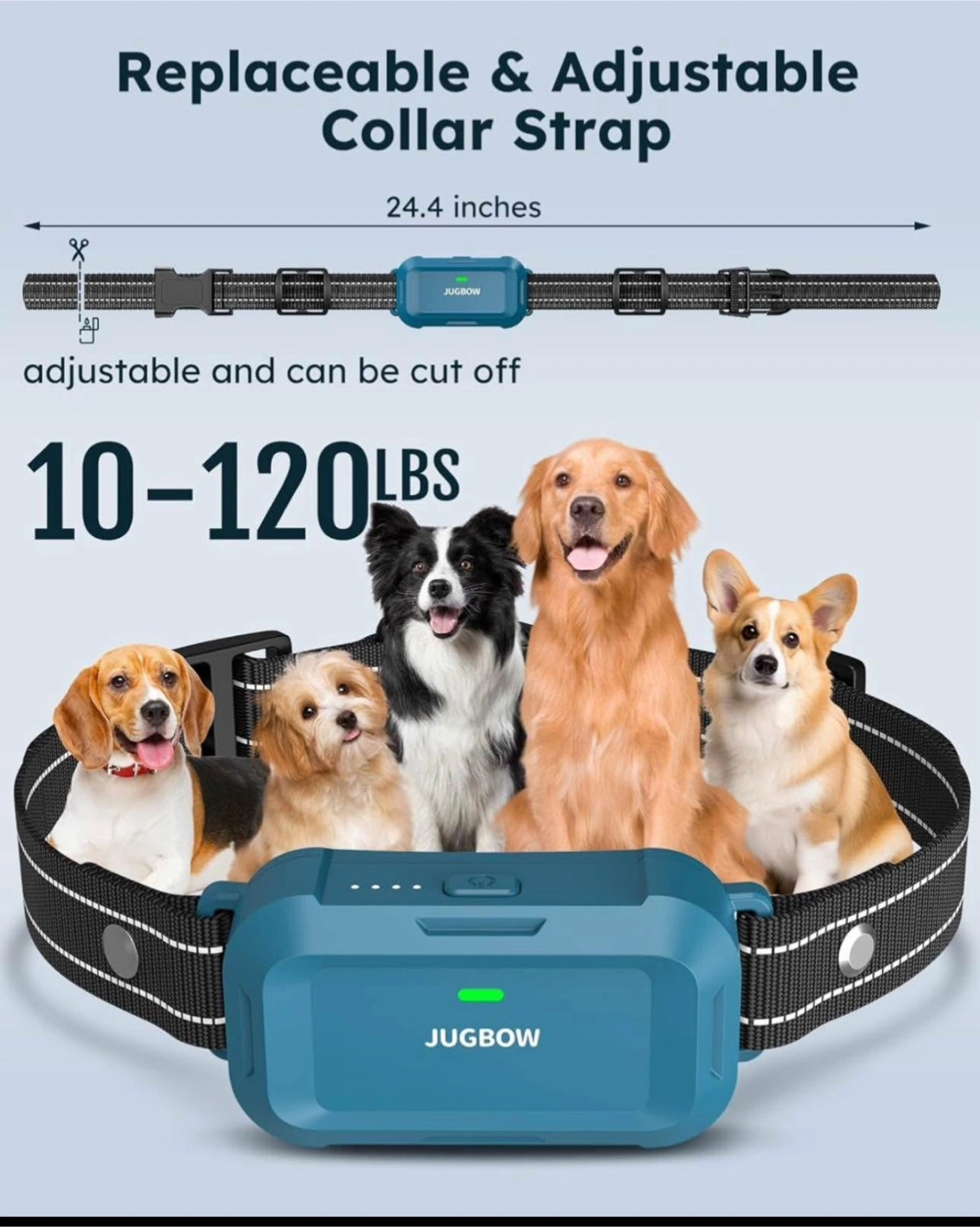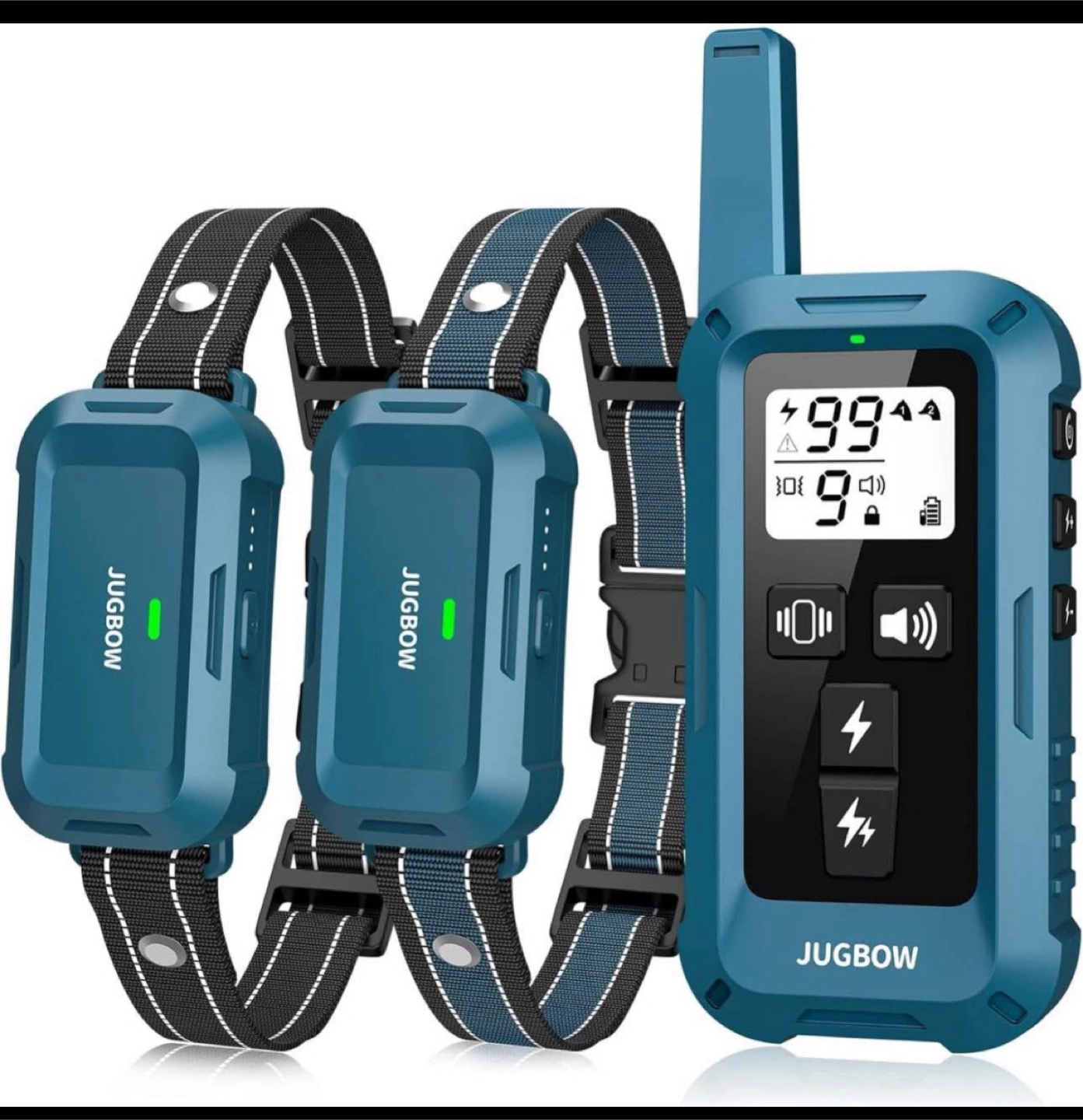 72Pattern Solid Colour Upgraded Blue 2 Pack Material: Nylon Brand: Jugbow Closure Type: Button Breed Recommendation: Small, Medium, Large Features: - Four Humanized Modes: Eliminate Negative Behaviour Effectively Our dog shock collar offers four humane training modes: beep (standard), vibration (1-9 levels), safe shock (0-99 levels), and Shock Boost (10% higher). This allows you to set the appropriate stimulation levels for your pet, effectively deterring undesirable habits. - Extended 4200FT Range & 2 Channels: Complete Freedom During Training With an impressive 4200FT range, you can train your dog at the park, beach, or backyard without any limitations. The e collar supports two channels and has a memory function for settings, enabling you to train two dogs simultaneously without resetting the levels. - IPX8 Waterproof & No Burden Collar: Confidently Train Your Dog The training collar is IPX8 waterproof and lightweight, ensuring that you can confidently train your dog without concerns about water damage or pressure on its neck. - Fits for All Sizes of Dogs: Designed for Skin-Friendly and Soft Nylon Straps Made of skin-friendly and soft nylon straps, the beep vibration collar accommodates dogs with neck sizes ranging from 7.8 to 24.4 inches and weights from 10 to 120 lbs. It is suitable for large, medium, and small dogs. - Safe and Easy to Use: Ergonomic Design and Lock Button The remote is ergonomically designed with large buttons and a clear functional layout, facilitating dog training. It also features a safe lock button that prevents unintentional operation when placed in your pocket during breaks.