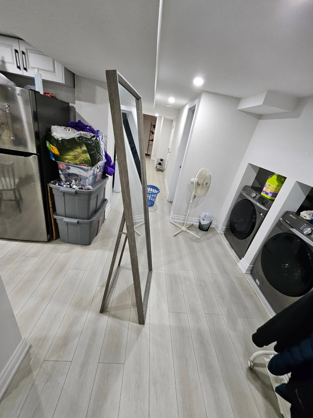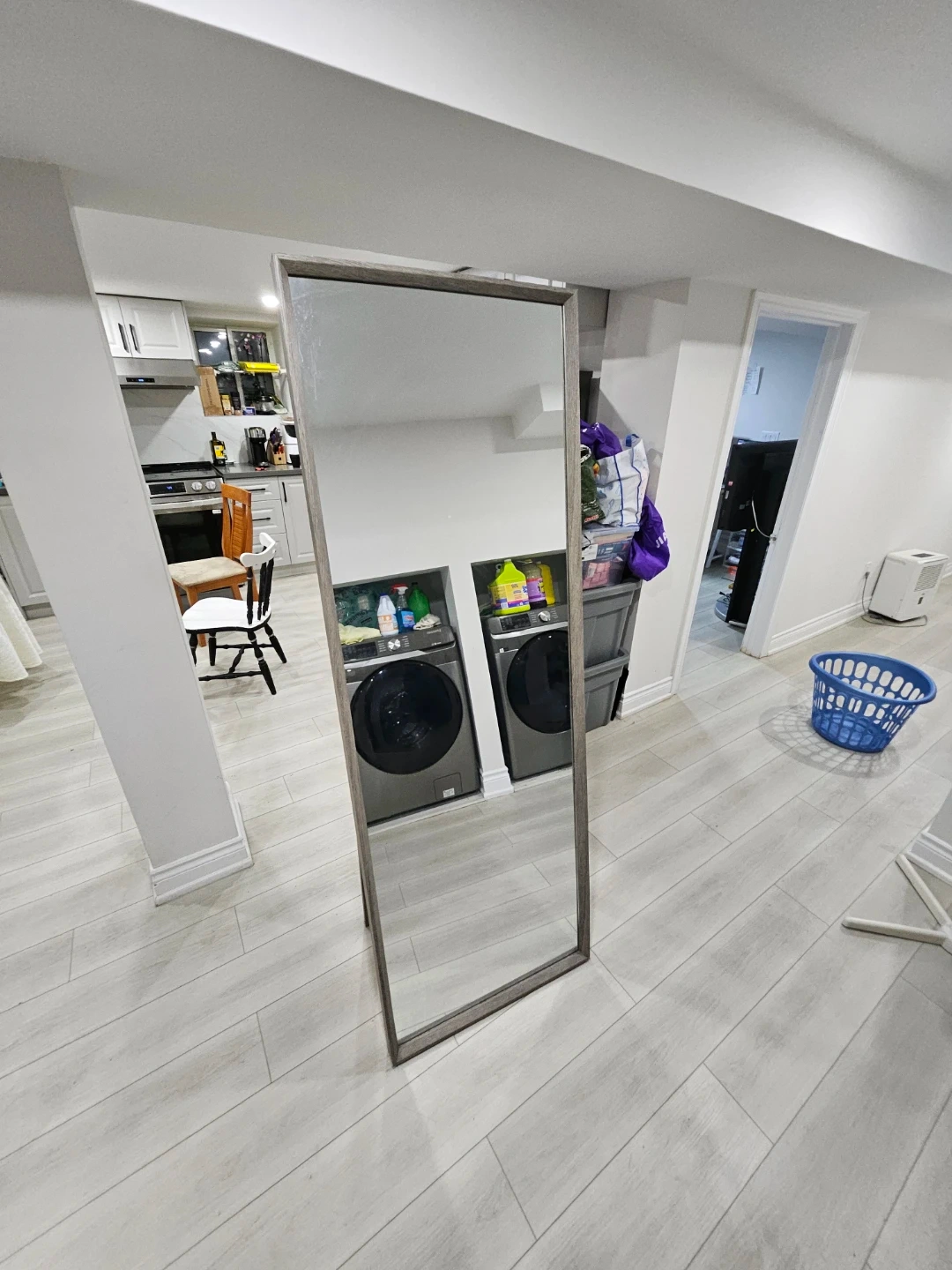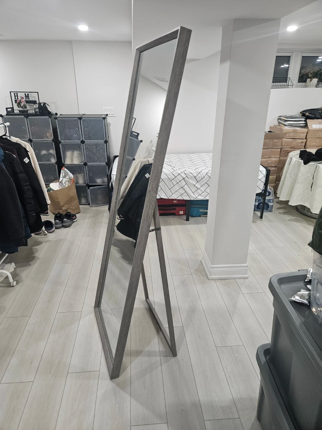 This is a full-length floor mirror with a modern grey wood-look frame. It's designed to stand on its own, making it easy to place anywhere. The mirror is large and provides a clear reflection.